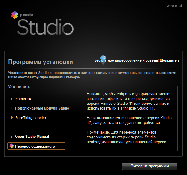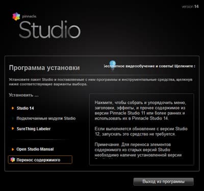 Средство переноса содержимого появилось в предыдущей версии программы. Его работа заключается в поиске элементов содержимого из предыдущих версий Studio: меню DVD-дисков, титров, переходов, эффектов, звуков, комплектов Premium Pack, RTFx и Hollywood FX, а также элементов содержимого, приобретенных и активированных пользователем через Интернет. Всё найденное содержимое копируется в папку Pinnacle Studio 14 и может быть использовано в новой версии программы.