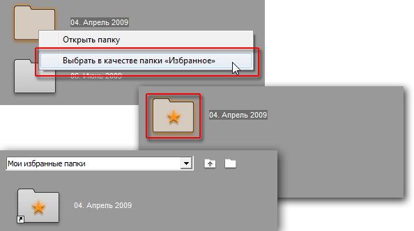 А эта новинка также касается усовершенствования навигации и поиска нужного материала. Модернизация заключается в появившейся возможности назначать произвольным папкам атрибута "Избранного". После назначения такого атрибута папка награждается оранжевой звёздой, и быстро найти её можно, выбрав из выпадающего списка папок строку Мои избранные папки.