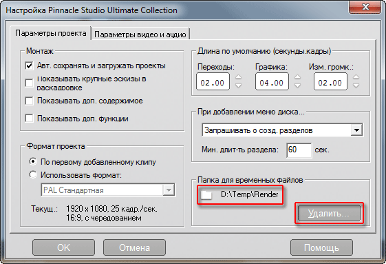 Помимо такого распорядка, внимательный пользователь обязан время от времени подчищать хвосты, которые программа оставляет во время работы. Для этого существует кнопка "Удалить", с помощью которой выполняется очистка диска от ненужных временных файлов. И, кстати говоря, если при внесении в проект каких-то изменений вы вдруг обнаруживаете, что они не желают отображаться на экране, или отображаются некорректно — немедленно ищите эту кнопку и смело топите её мышкой. Тем самым вы удалите файлы прежнего фонового рендеринга, заставив программу создать новые. На новых, соответственно, условиях.