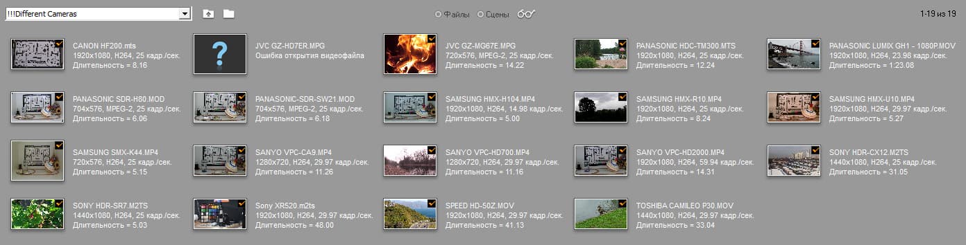 Как видим, программа споткнулась лишь на одном из 19 разных видеофайлов, снятых 19 разными же видеокамерами (название файла соответствует модели видеокамеры; файлы являются оригинальными, перепаковке и уж тем более перекодированию не подвергались).