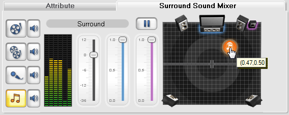Отдельно стоит рассмотреть работу со звуком. Как упоминалось, версия, имеющая в названии слово Plus, поддерживает обработку многоканального Dolby® Digital 5.1 Surround Sound. Так легко и незатейливо ведется настройка расположения виртуального зрителя относительно нескольких динамиков, расставленных по комнате. Положение каждого из звуковых клипов, имеющихся на таймлинии, редактируется отдельно, так что существует интересная возможность поэкспериментировать: в левый задний динамик отправить речевые комментарии, а в правый передний — фоновую музыку. Конечно, злоупотреблять такой важной составляющей фильма, как звук, нельзя.
