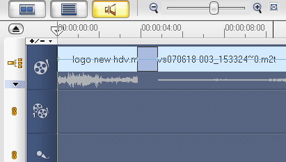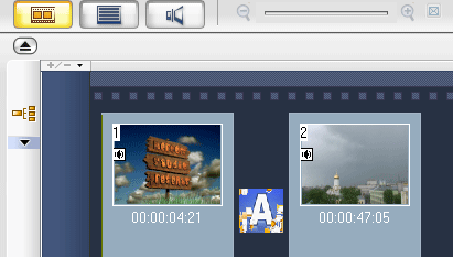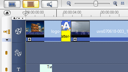 Вернемся к вкладкам, среди которых Edit является главной. Все остальные вкладки так или иначе — обслуживающие, выполняют вспомогательные функции (выбор и добавление эффектов, переходов, титров и прочее). Внешний вид тайм-линии легко изменить, нажав одну из трех кнопок слева. Вид, представляющий собой цепочку кадров (клипов):