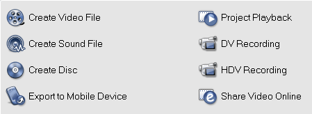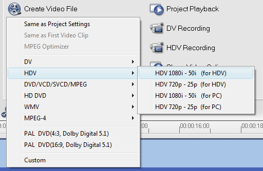 Кнопкой DV Recording можно записать ваш проект на miniDV кассету, при этом необходимо заранее подключить miniDV камкордер к ПК. Следующая за ней кнопка HDV Recording всего лишь запускает процесс конвертации проекта в один из HD-форматов.