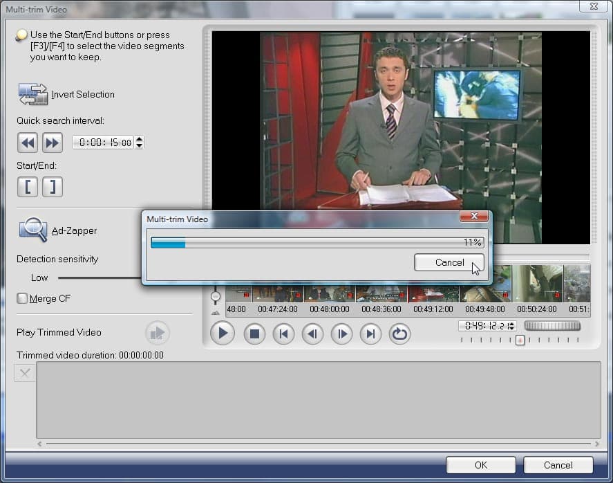 Если ваш файл слишком сложный, в нем слишком много меняющих друг друга мало отличимых сцен, то можно воспользоваться и более продвинутым резчиком, где все операции производятся вручную. Это — модуль Multitrim Video. Помимо обычной нарезки, данный модуль (так заявляется разработчиком) имеет механизм автоматического определения рекламы в анализируемом видео. Этот способ анализа видео запускается кнопкой Ad-Zapper, и работает довольно быстро: анализ полуторачасового mpeg-файла (запись с ТВ-эфира) занял всего около двух минут (интересно, почему так быстро?).