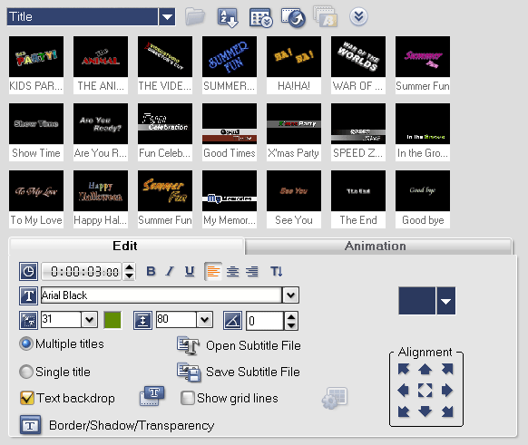 Но не только статичные титры разрешено создавать в этой программе. Вкладка Animation содержит 78 предустановок, разбитых на восемь подгрупп; с их помощью любой сможет создать такую траекторию движения титров, которая его устроит. Кириллица, конечно, поддерживается.