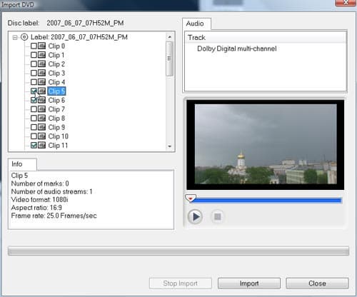 Программа без труда распознала все имеющиеся на диске клипы, и предложила выбрать любой из них для импорта в проект. Что и было сделано.