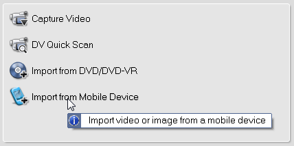 Следующая за ней кнопка Import from Mobile Device — это веление времени, ведь теперь у каждого уважающего себя офисного работника в кармане рубашки обязательно найдется сотовый телефон, оснащенный видео-фотокамерой. Небольшое окно содержит список устройств, подключенных к ПК, и примитивный браузер для просмотра обнаруженных на них фото и видеоматериалов.