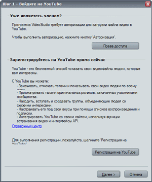 Сразу по окончании рендеринга программа предложит авторизоваться на сервере YouTube, либо, если вы еще этого не делали, зарегистрироваться прямо сейчас.
