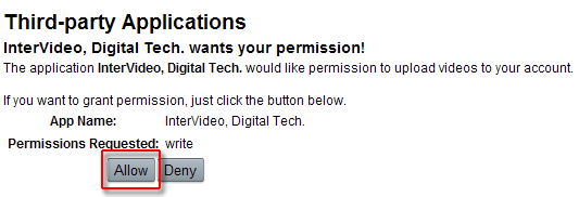 Пара минут и регистрация пройдена, можно приступать к скачиванию фильма на сервер YouTube. Жмем кнопку Права доступа тут же запускается браузер с личной стартовой страничкой. Здесь нужно согласиться, нажав кнопку Allow.