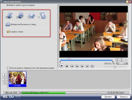 В открывшемся модуле создания дисков пользователь может видеть все те инструменты, которые доступны и при авторинге обыкновенного DVD-видео диска. При этом основной фильм на таймлинии выглядит как единственный клип — но пусть это вас не смущает. Если вы не желаете дополнять свой диск каким-либо материалом (для чего служат расположенные поверху кнопки) — смело нажимайте кнопку Добавить/Изменить главу.