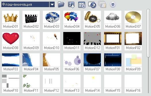 Домашнему пользователю наверняка понравятся встроенные в программу анимационные заготовки (футажи) в flash-формате, которых насчитывается 49 штук.