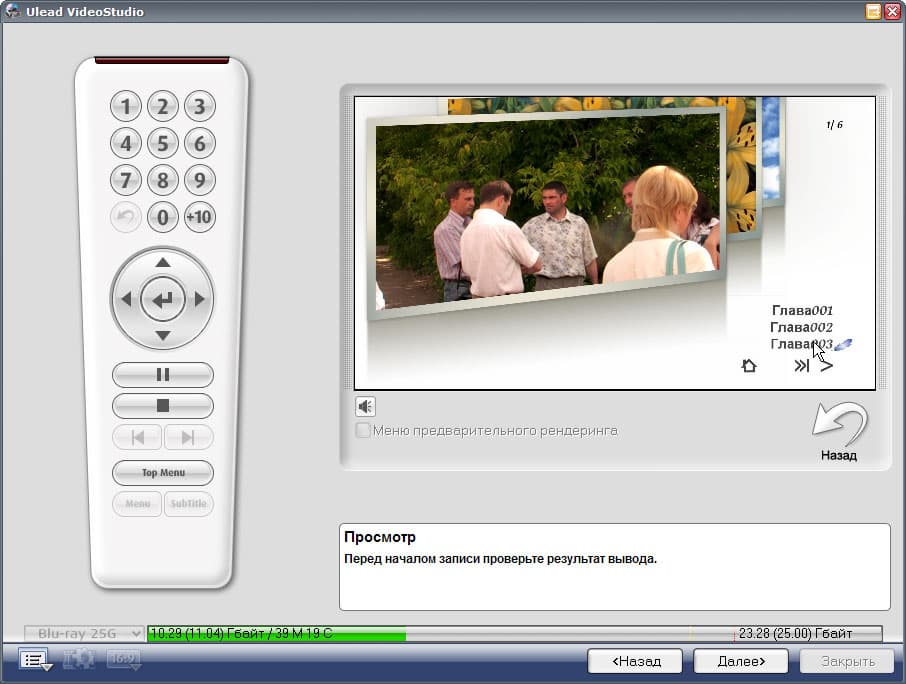 Для пущего удобства в программе предусмотрен просмотр созданного меню без рендеринга (и тем более прожига) всего диска. Нажмите одноименную кнопку с пиктограммой в виде ИК-пульта, и после быстрого предварительного просчета программа даст возможность увидеть сделанные пользователем изменения. Во время просмотра меню пользователь видит все до единого эффекта, каждый пункт меню доступен; уровень фонового звука, как ему и положено, плавно нарастает и затухает по окончании заданного времени. Навигация по диску производится как с помощью кнопок виртуального пульта, так и курсором мыши на самом меню.
