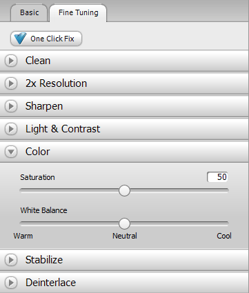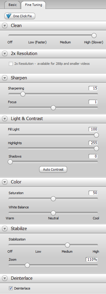 Но всё-таки функциональности инструментов в виде одних лишь кнопок явно недостаточно. Что-ж, и здесь разработчик предусмотрел специальные настройки, позволяющие провести более тонкую подгонку всех параметров. Настройки эти расположены на вкладке Fine Tuning. Как видим, здесь скрываются ещё две настройки, не видимые во вкладке Basic: Color, позволяющий изменить насыщенность цвета и баланс белого, и Deinterlace, проводящий деинтерлейс кадра (устраняющий пресловутую расчёску, или грёбенку).
