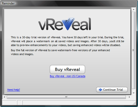 Запуск программы сопровождается вступительной заставкой, выводящей предупреждение о некоторых ограничениях trial-версии. Оказывается, помимо стандартного 30-дневного ограничения, здесь присутствует ещё одно: накладываемый поверх сохраняемого видео полупрозрачный "водяной" знак с логотипом vReveal.