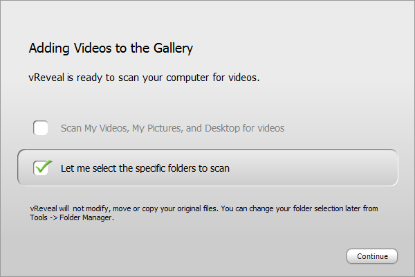 В начале работы vReveal предложит просканировать папки пользователя на предмет поиска видеофайлов. Непонятно, зачем всё это... Такое ощущение, словно программа разработана исключительно для домашнего пользователя, уверенного, что все его видеофайлы должны храниться только в папке Documents and Settings/Default User/My Videos, или вообще на Рабочем столе.