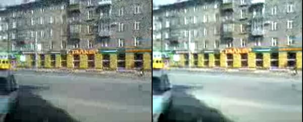 Впрочем, есть тут и довольно занятная возможность сохранения видеофайла сразу в обоих вариантах: в одном видеокадре будут расположены обе версии видео, оригинальная и обработанная фильтрами (на снимке один из примеров такой работы; в качестве исходного видео взята съёмка мобильным телефоном). Конечно же, чудес не бывает, нельзя показать недостающие детали, если их изначально не было в кадре. Но скрыть шум матрицы, смягчить пикселизацию, сделать чётче контрастные объекты, оказывается, вполне возможно: сравните количество шума в необработанном (слева) и обработанном кадрах (справа). И что интересно очистка от шума хоть и происходит за счет сглаживания, однако, несмотря на это, замыливания картинки мы не наблюдаем: в обработанном кадре название магазина по-прежнему отчетливо видно.