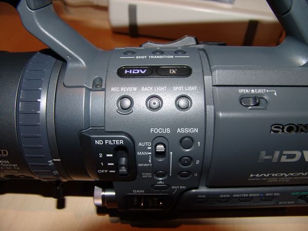 Они включают в себя кольца фокусировки и зума на объективе, а также маленькое металлическое рядом для управления диафрагмой. Доступны ручное управление усилением при помощи 3 градаций, балансом белого (2 ячейки памяти для быстрого переключения пресетов) и скоростью затвора (1/3-1/10000 с.). Есть 2 градации нейтрального фильтра (1/6 и 1/32 исходного светового потока), кнопки активации режимов «задний свет» и «прожектор», а также 3 программируемые кнопки. Все это находится на боковой панели под левой рукой оператора. Под ручкой для переноски видны светящиеся индикаторы текущего режима работы (HDV/DV) и набор кнопок Shot Transition — для плавного изменения параметров (например, глубины резкости) во время съемки.