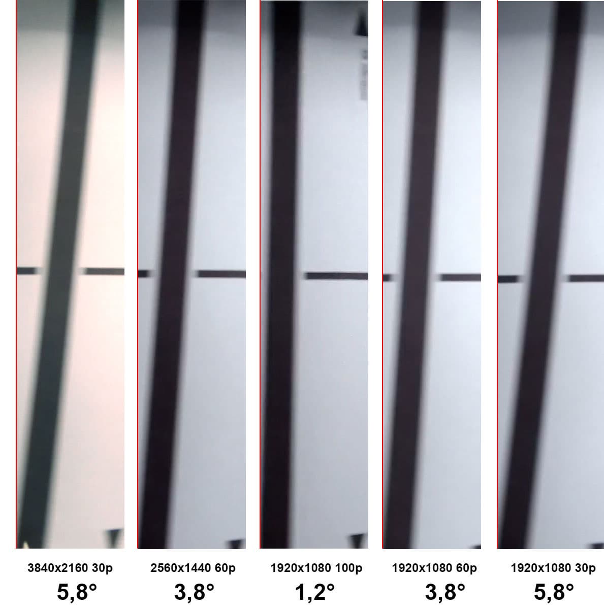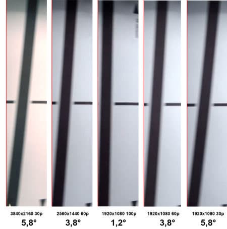 Следующий на очереди вопрос — роллинг-шаттер (подробнее см. в материале Роллинг-шаттер в видеосъемке — описание дефекта, примеры, пояснения). Наклон вертикалей в съемке нашей камерой вполне поддается измерению, ведь в кадре нет дефекта FishEye, Рыбий Глаз. С помощью нашего стенда с вращающимся диском, на который нанесена вертикальная линия, был получен вполне «читабельный» результат. Размытые линии вследствие слишком близкого расположения стенда к объективу совершенно не мешают измерить искомые углы.