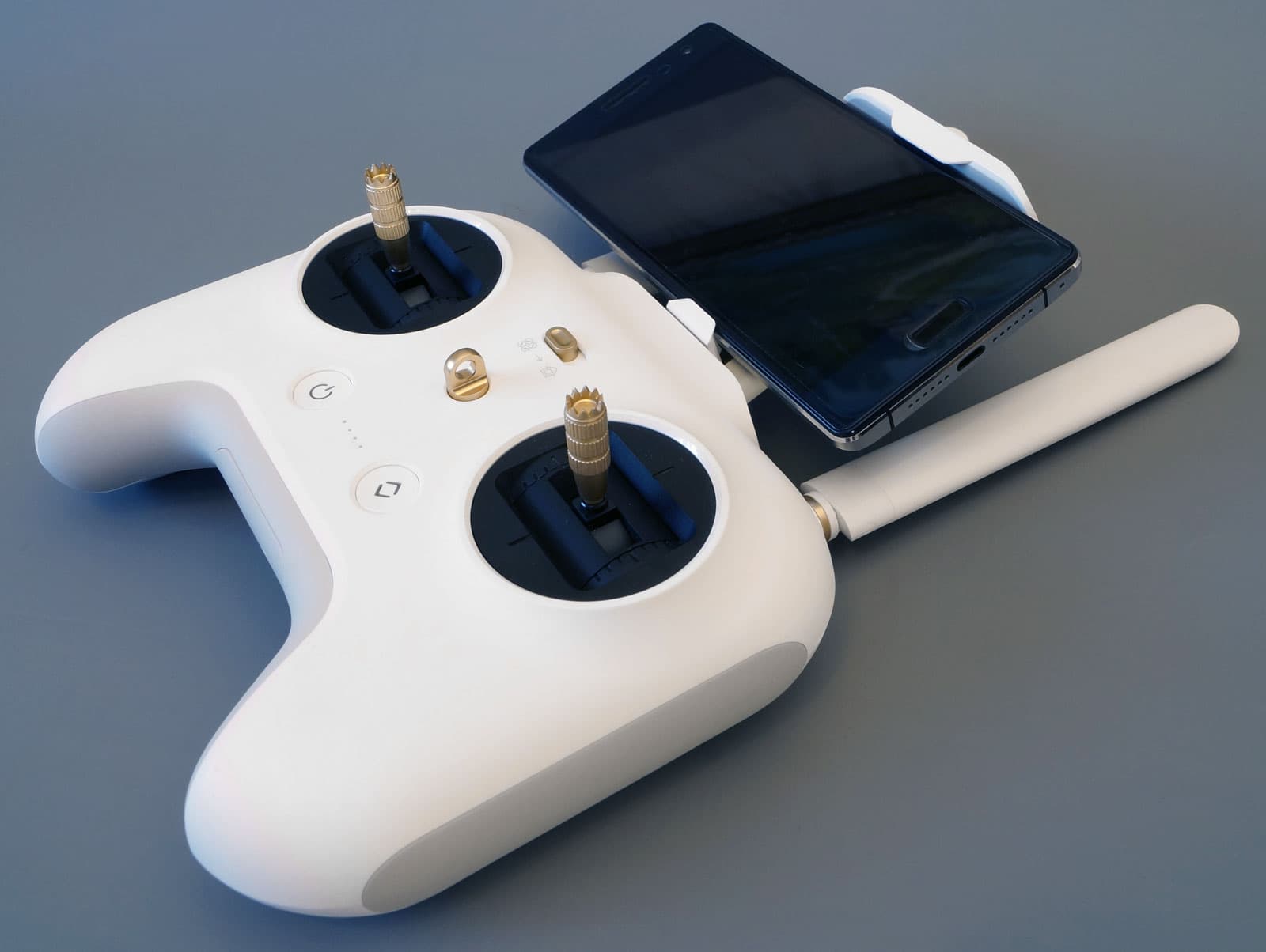 Прилагаемый пульт дистанционного управления позволяет закрепить на нем смартфон. Соединение пульта с мобильным устройством осуществляется как по коротенькому кабелю USB, так и через Wi-Fi-точку, которую создает пульт, когда к нему подключен прилагаемый Wi-Fi-адаптер.