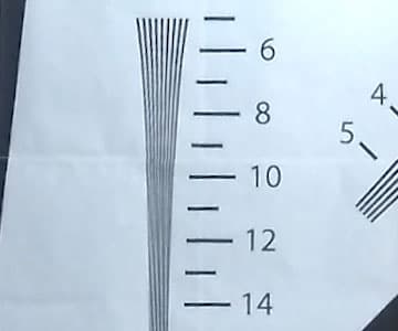 Измерение разрешающей способности камеры производилось при ярком искусственном освещении. Ввиду довольно большого угла обзора камеры нельзя произвести съемку тестовой таблицы целиком, для такой съемки таблица должна иметь слишком большие размеры. Ближе к объективу придвигать эту таблицу означает покинуть зону фокусировки (минимальное расстояние, на котором все объекты находятся в фокусе, составляет 30-40 см). Поэтому мы прибегли к другому проверенному способу — к съемке с разных расстояний одного участка таблицы, распечатанного на листе метровой высоты. Впоследствии полученное видео совмещается в видеоредакторе с оригинальным изображением тестовой таблицы до совпадения пропорций ключевых участков, при этом изменение размера кадра не происходит. В результате получается искомый ключевой участок, в котором кроется ответ на вопрос о разрешающей способности.