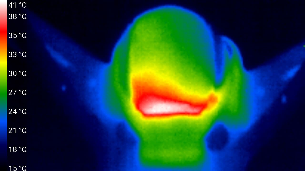 Тем не менее, положенные замеры нагрева камеры были произведены. Не в полете, конечно, а в стационарных условиях при комнатной температуре. Следующие теплоснимки получены после 15 минут беспрерывной видеозаписи в самом старшем режиме — 4K (3840×2160 30p). Можно видеть, что отдельные участки камеры — в верхней части шарообразного корпуса и в блоке стабилизирующих приводов — нагрелись до 40-41 °C. Так себе нагрев, не стоящий внимания и тем более тревог с учетом приведенных выше соображений.