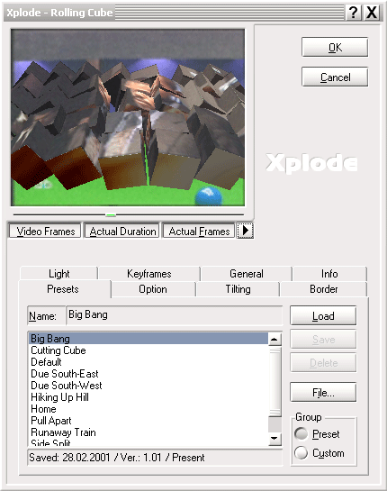 По нажатии кнопки Options появится окно расширенной настройки перехода. Здесь доступно практически всё: от выбора типа 3D объекта и наложения теней, до смены текстур объекта и способа их движения. Разумеется, сам переход здесь можно увидеть в движении без предварительного просчета (рендеринга). Также существует возможность импорта в программу своих 3D моделей. Xplode работает с файлами в формате *.Х3D, поэтому модели, скорее всего, придется конвертировать при помощи специальной утилиты Canopus 3DS Compiler.
