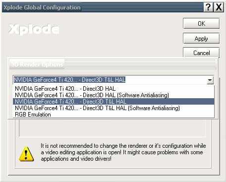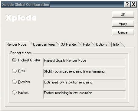 Xplode имеет утилиту конфигурирования Xplode Config, где можно выбрать качество и способ рендеринга - программно или посредством GPU.