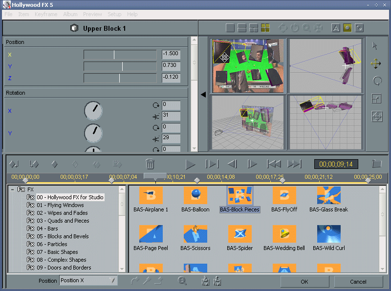 Программа берет свое начало с 1994 года! В отличие от Canopus, Pinnacle Systems сама не разрабатывала этот набор, а приобрела в конце девяностых компанию Hollywood FX с уже четвертой версией продукта (кстати, после того, как разработала свой 3D плагин под названием FreeFX). Причем в рамках общей тенденции использования только собственных видеоредакторов, существуют 3 разновидности рассматриваемой версии набора - Plus и Mega (бывший Pro) для Pinnacle Studio 8, 9, 9Plus и Pro для Pinnacle Liquid 5, 6. Говоря кратко - в отличие от Xplode Pro, Hollywood FX 5 имеет более интуитивное управление: для новичка этот пакет поначалу может показаться чем-то вроде увлекательной игры - интерфейс этого пакета необычен и нисколько не напоминает профессиональные программы редактирования видео.