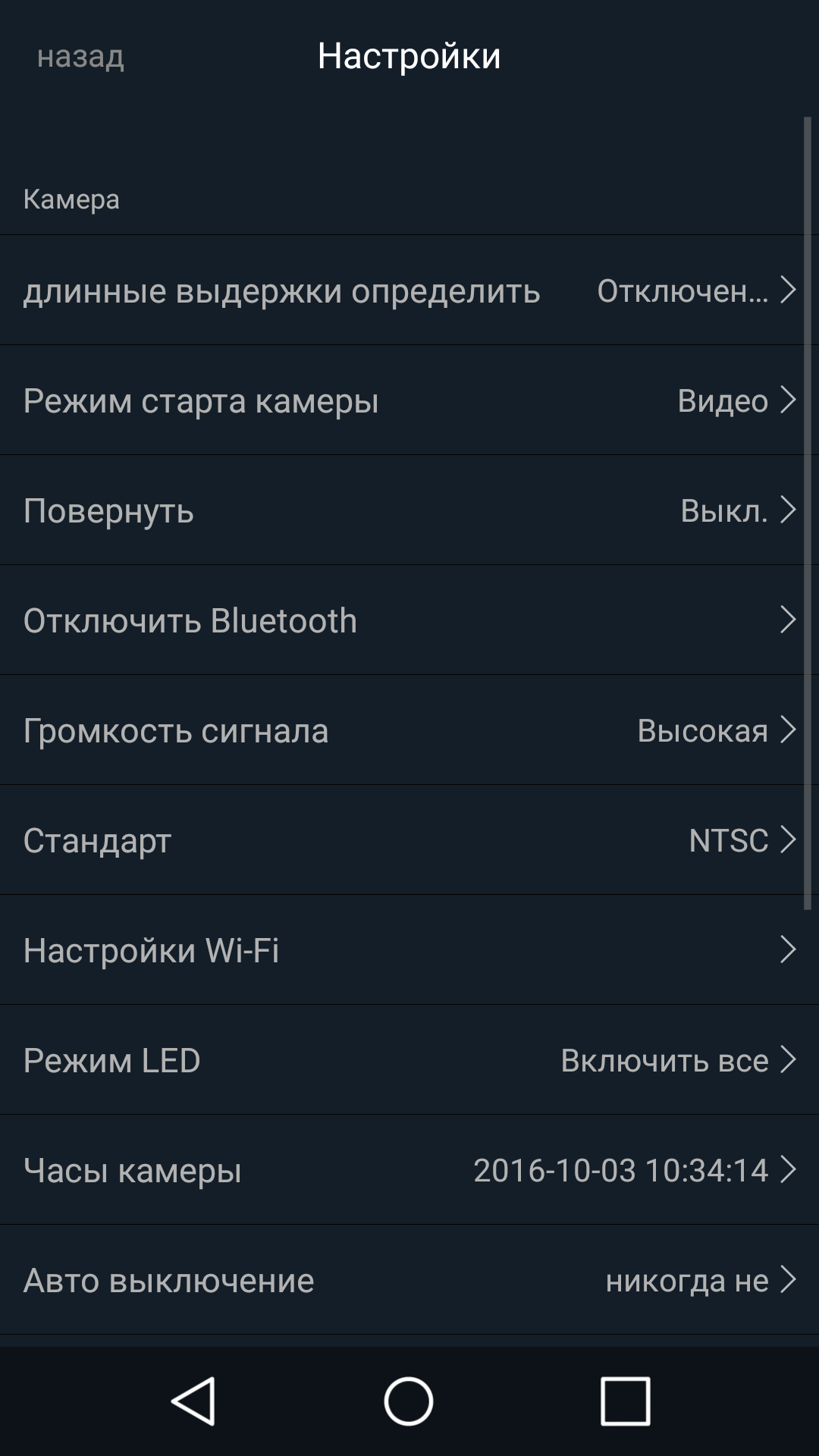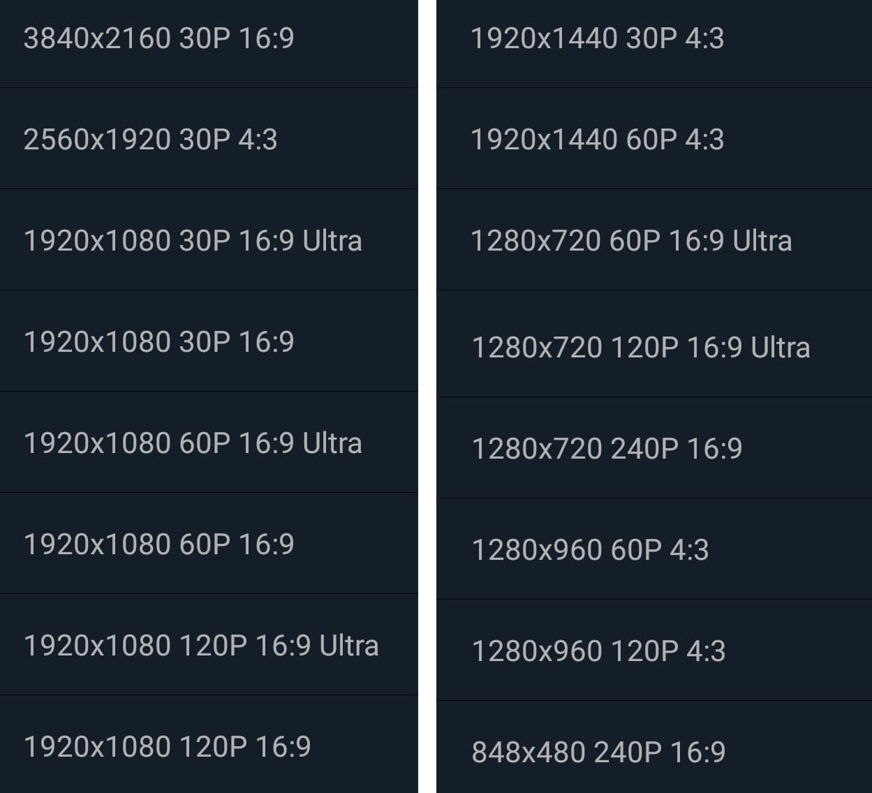 В мобильном приложении, с помощью которого можно управлять камерой, имеется широкий выбор разрешений и частот кадров, с которыми можно вести съемку. Даже слишком широкий. Выглядит он так:
