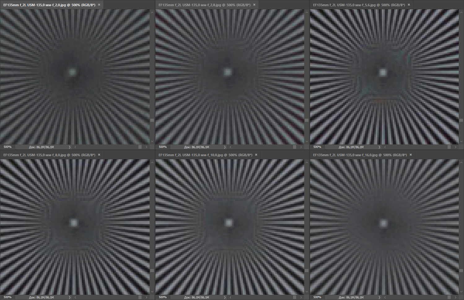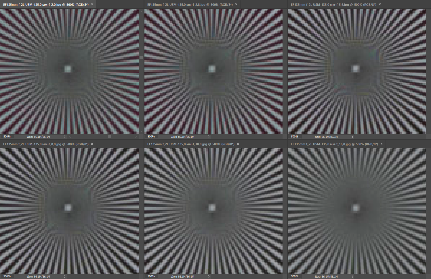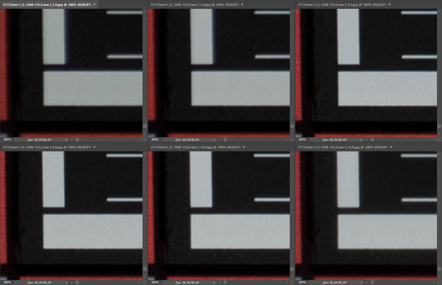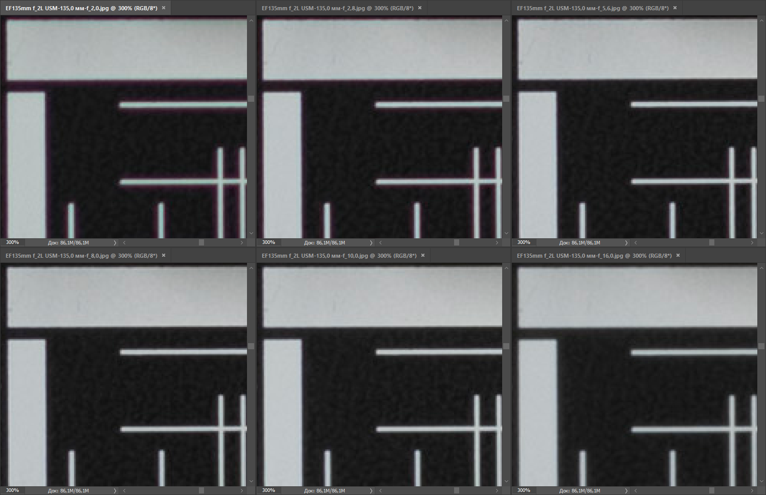 | На всех скриншотах верхний ряд: f/2,0 — f/2,8 — f/5,6, нижний ряд: f/8 — f/10 — f/16 | |||