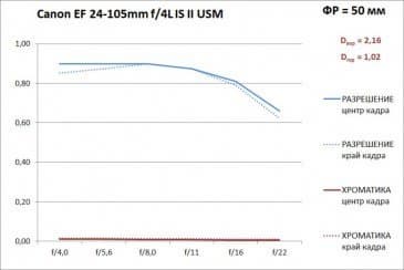 Переходим к 50 мм. На этом фокусном расстоянии дисторсия может быть выправлена полностью, но мы наблюдаем заметную «подушку» по горизонтали (Dгор = −1,02) и весьма заметную «подушку» по вертикали (Dвер = −2,16). В принципе это не очень страшно, но для «портретного» фокусного расстояния это многовато.