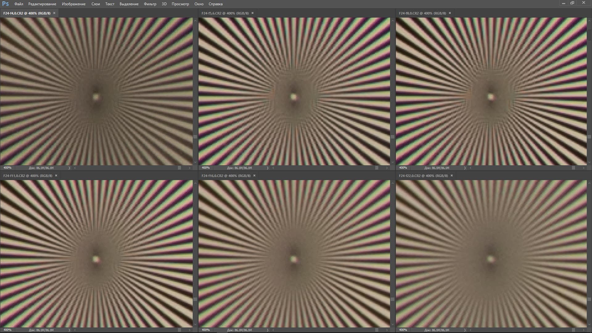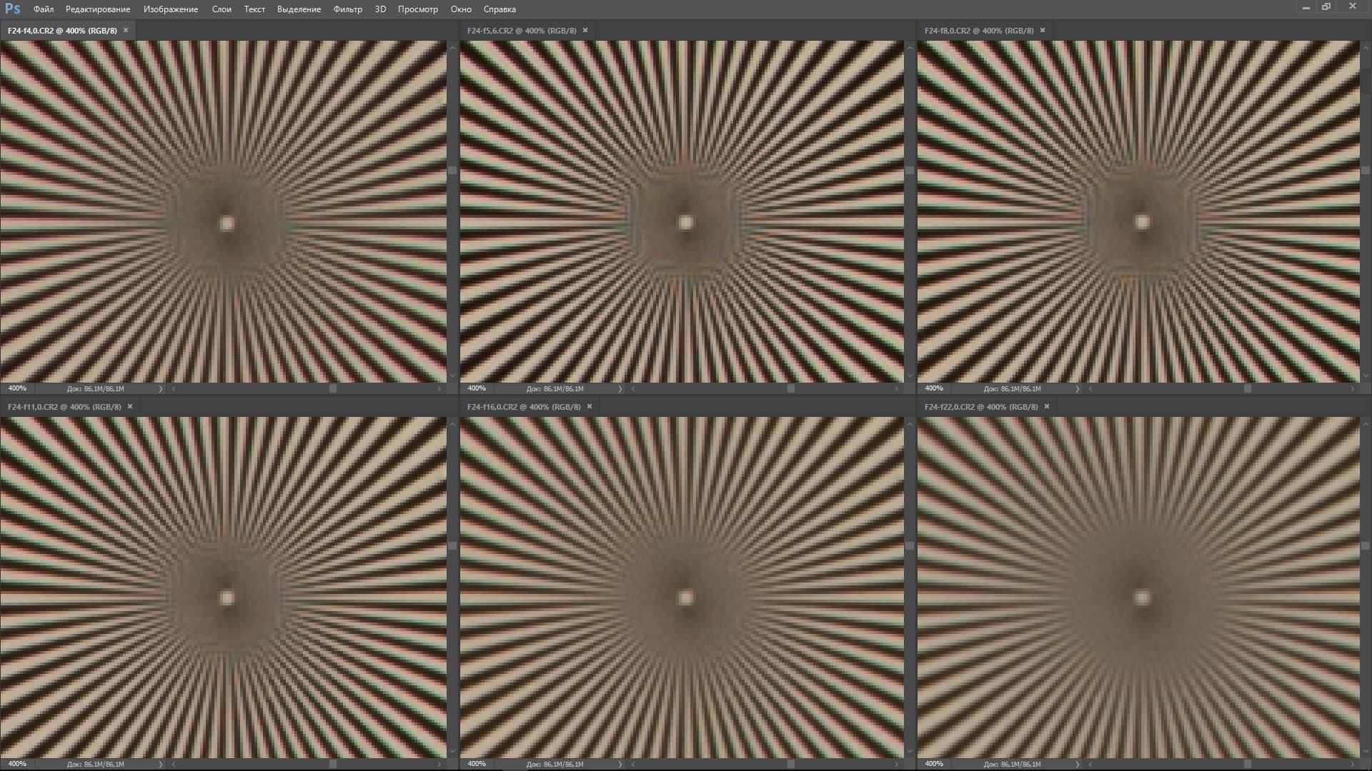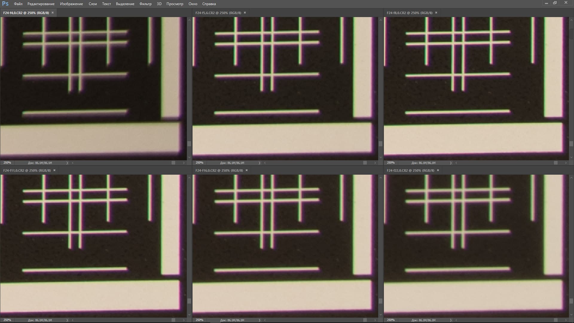 | На всех скриншотах верхний ряд: f/4,0 — f/5,6 — f/8,0; нижний ряд: f/11 — f/16 — f/22 | |||