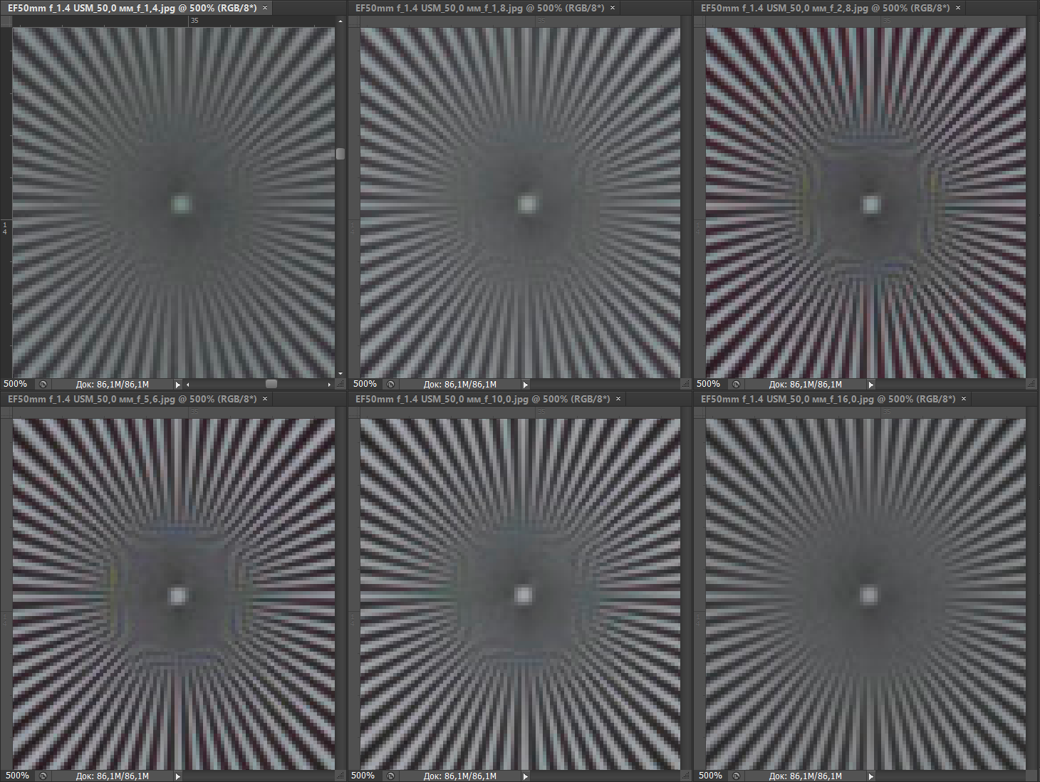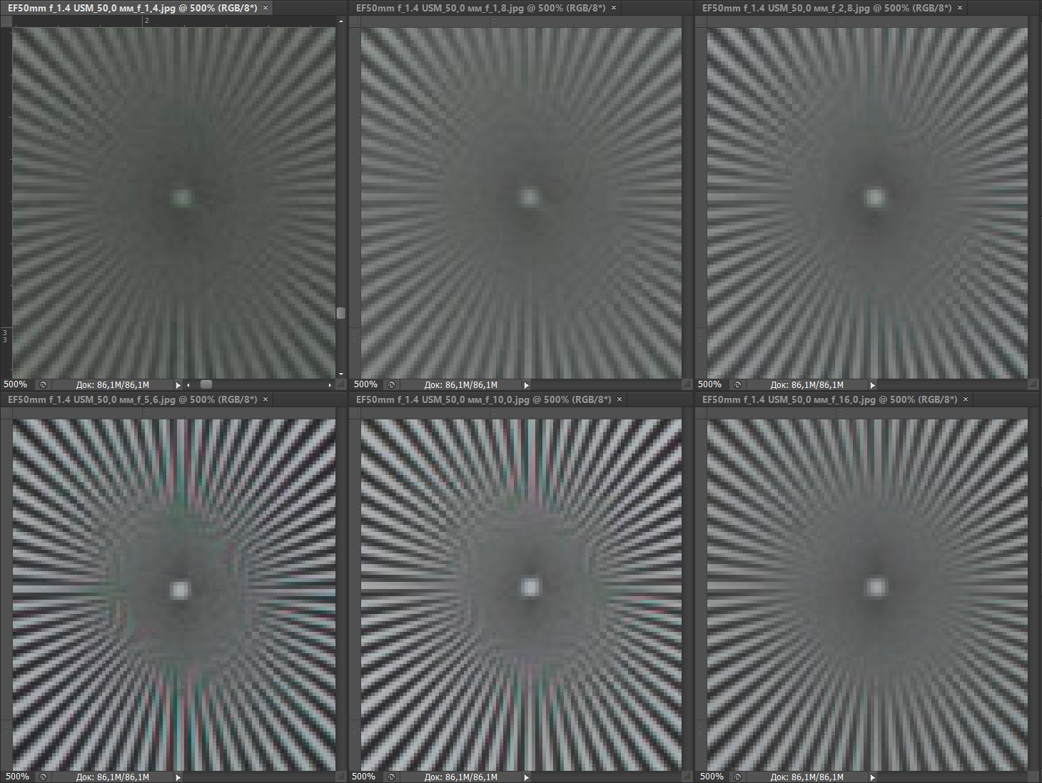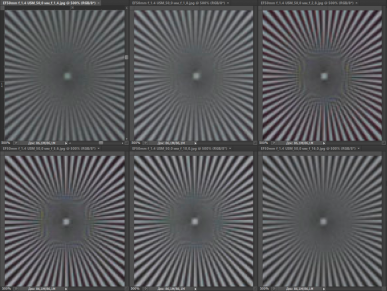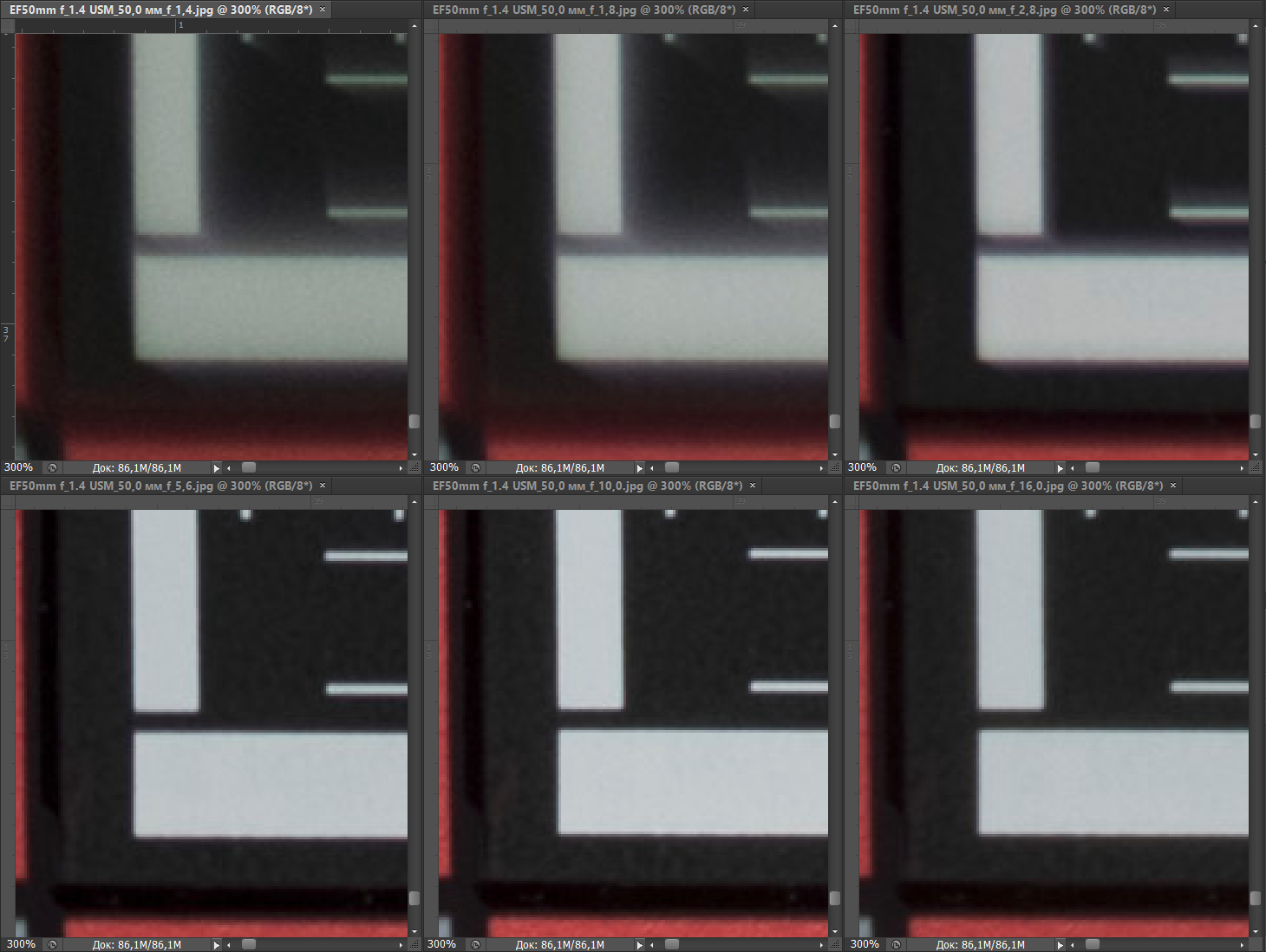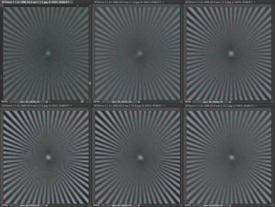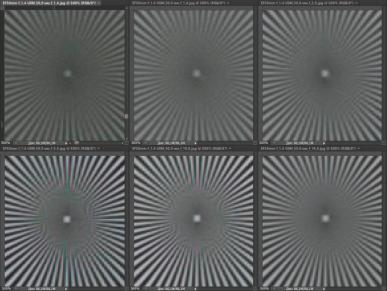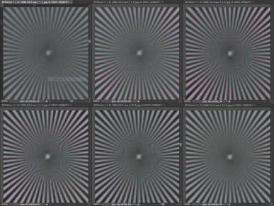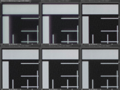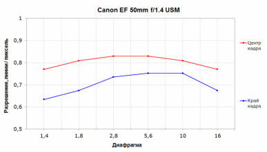 Резкость в центре кадра у испытуемых практически не различается. На краях кадра при f/2,8—f/8 она ощутимо выше у Canon EF 50mm F1.2L USM. При f/11 объективы практически неотличимы по картине резкости как в центре, так и на краях. Влияние дифракции начинает сказываться у Canon EF 50mm F1.4 USM при f/16, когда соперник вновь опережает его, однако и при f/22 результат достаточно хорош (у более дорогого конкурента нет такого значения диафрагмы).