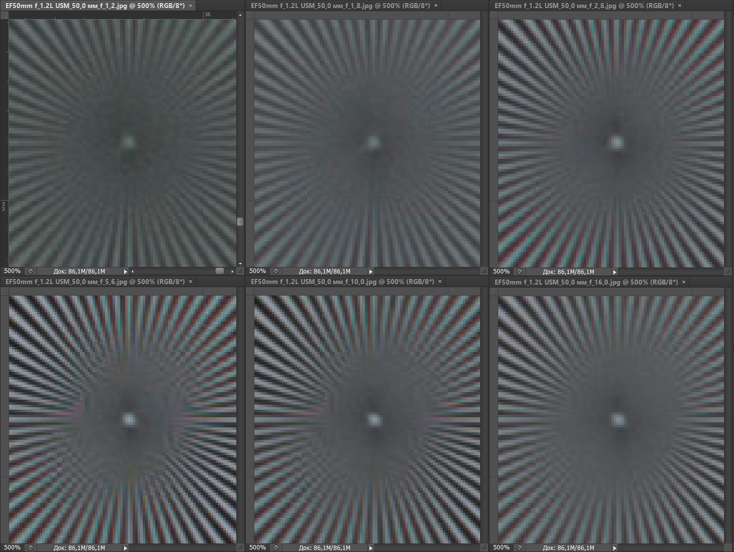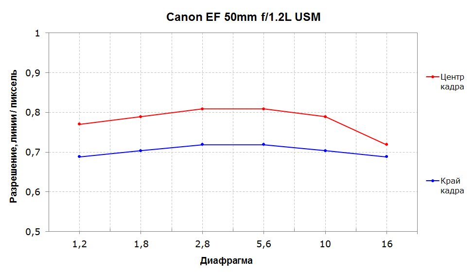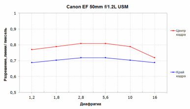 Отдельно хочется отметить, что Canon EF 50mm f/1.2L USM подает отличный пример наращивания светосилы: разрешение при этом не только не падает, как это обычно случается, но и стабилизируется на достаточно высоком уровне.