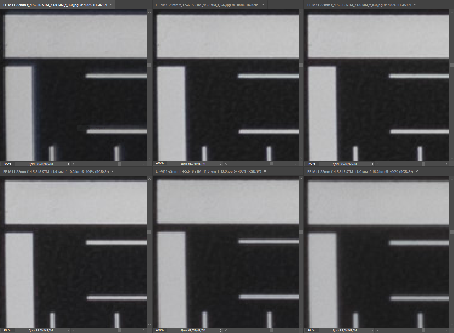 На 22 мм ситуация повторяется практически один в один: стабильно нормальное качество изображения в начале ряда диафрагменных чисел с плавным снижением резкости во второй половине.