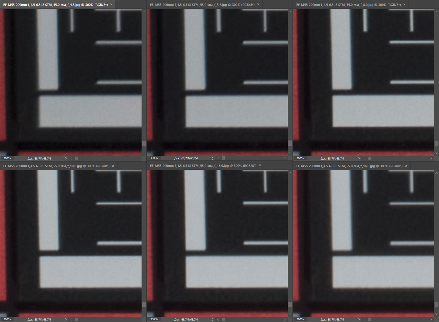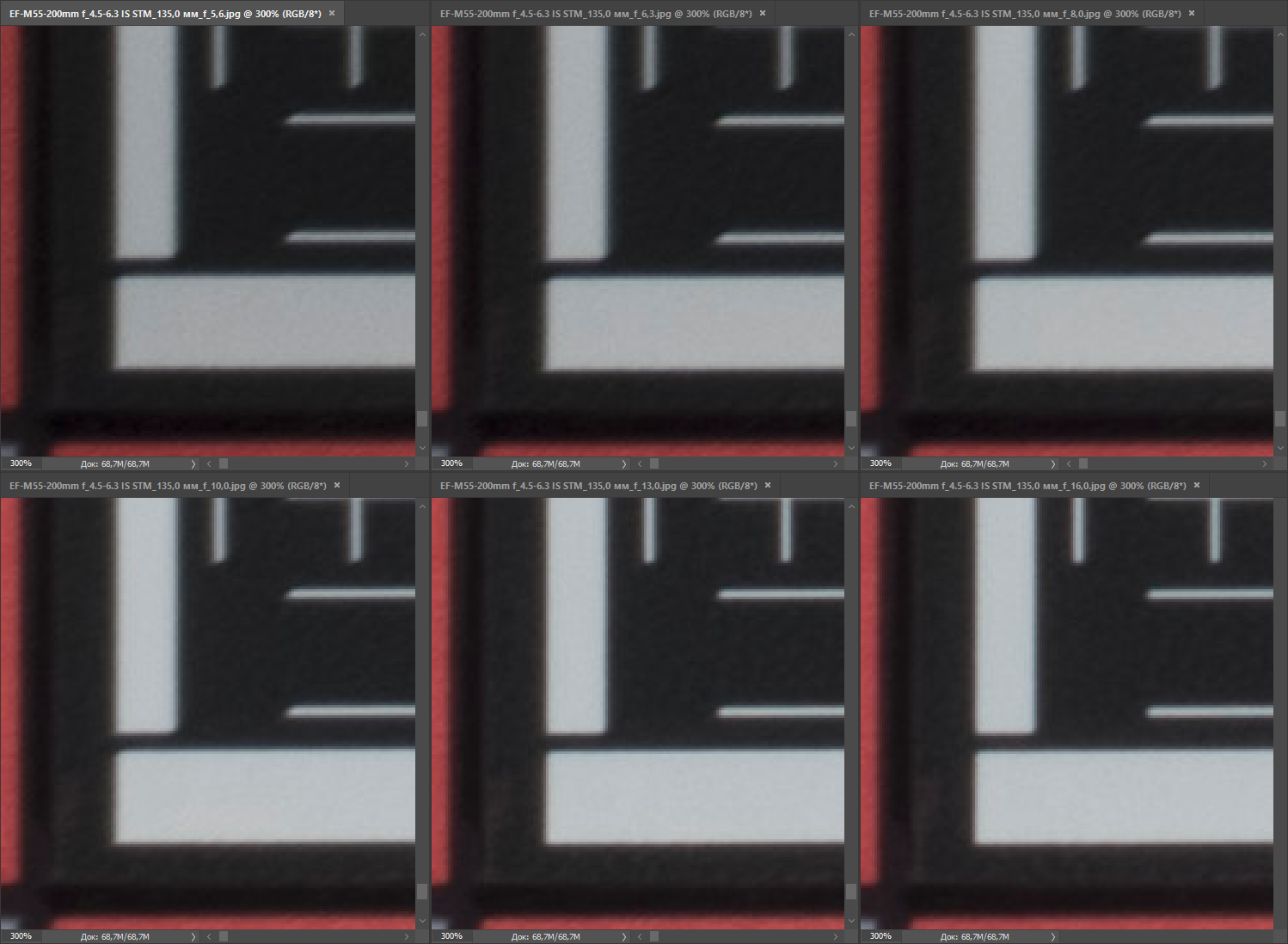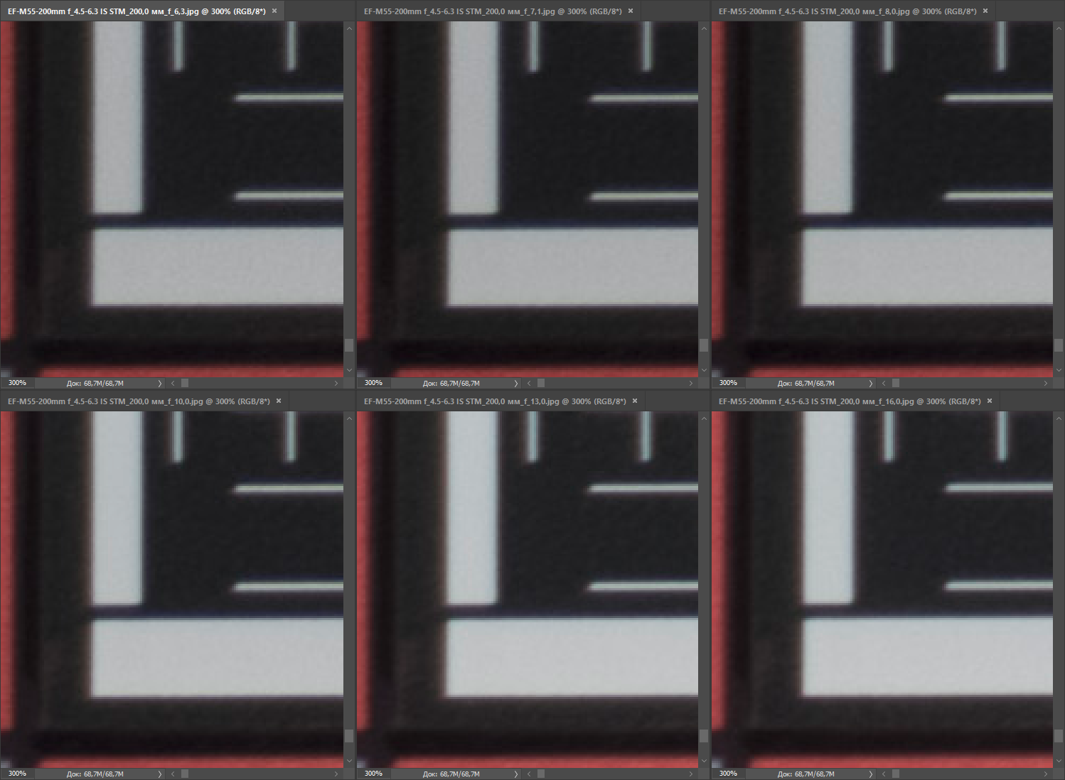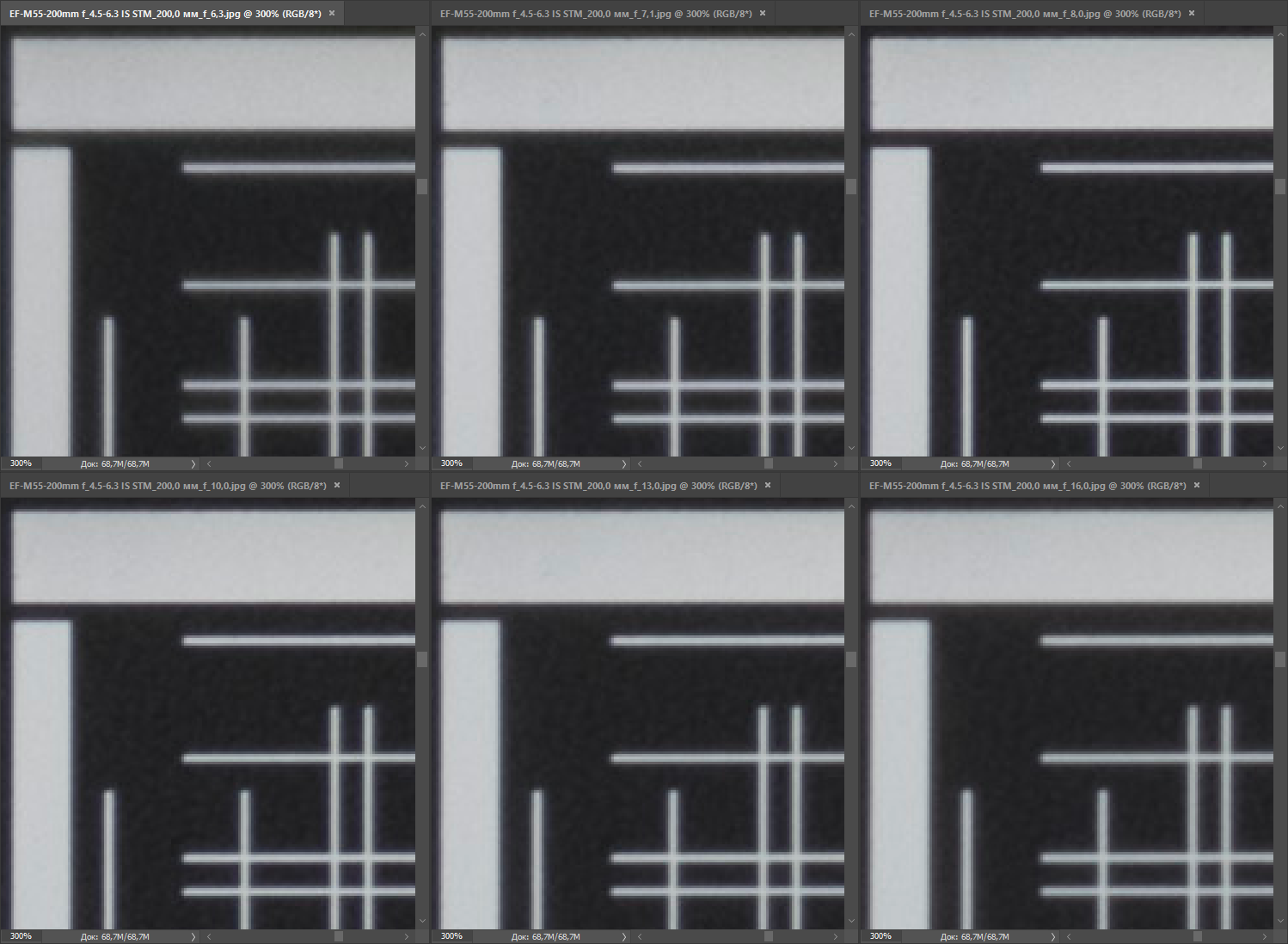 | на всех скриншотах верхний ряд: f/6,3 — f/7,1 — f/8, нижний ряд: f/10 — f/13 — f/16 | |