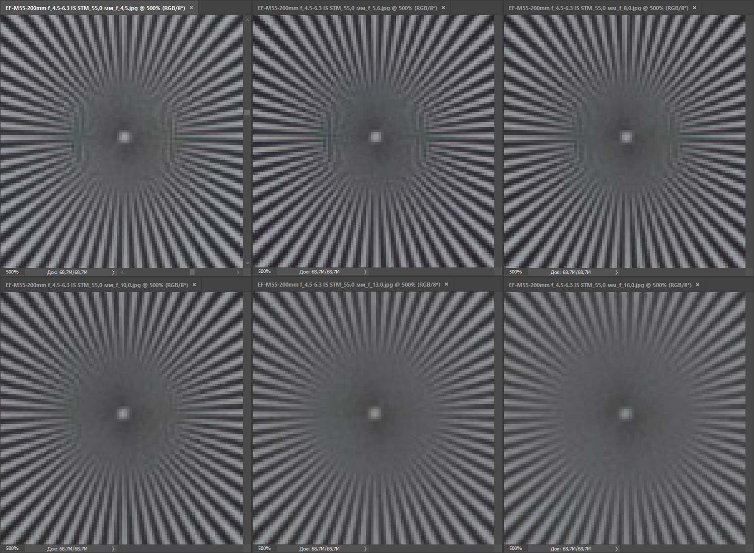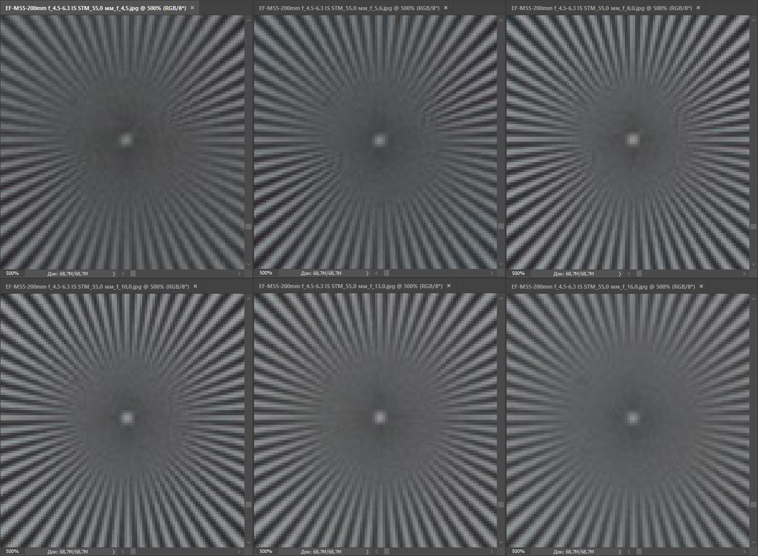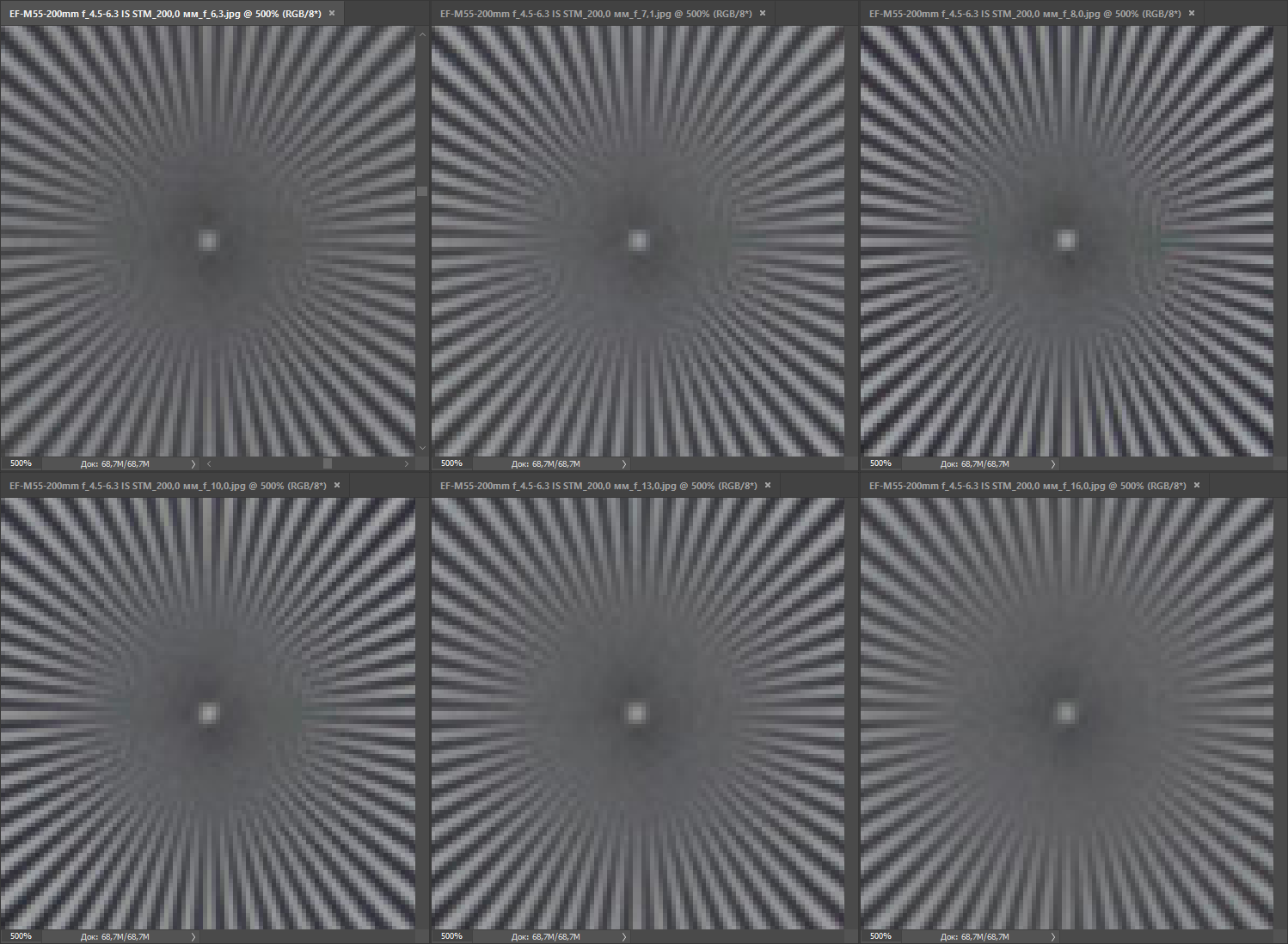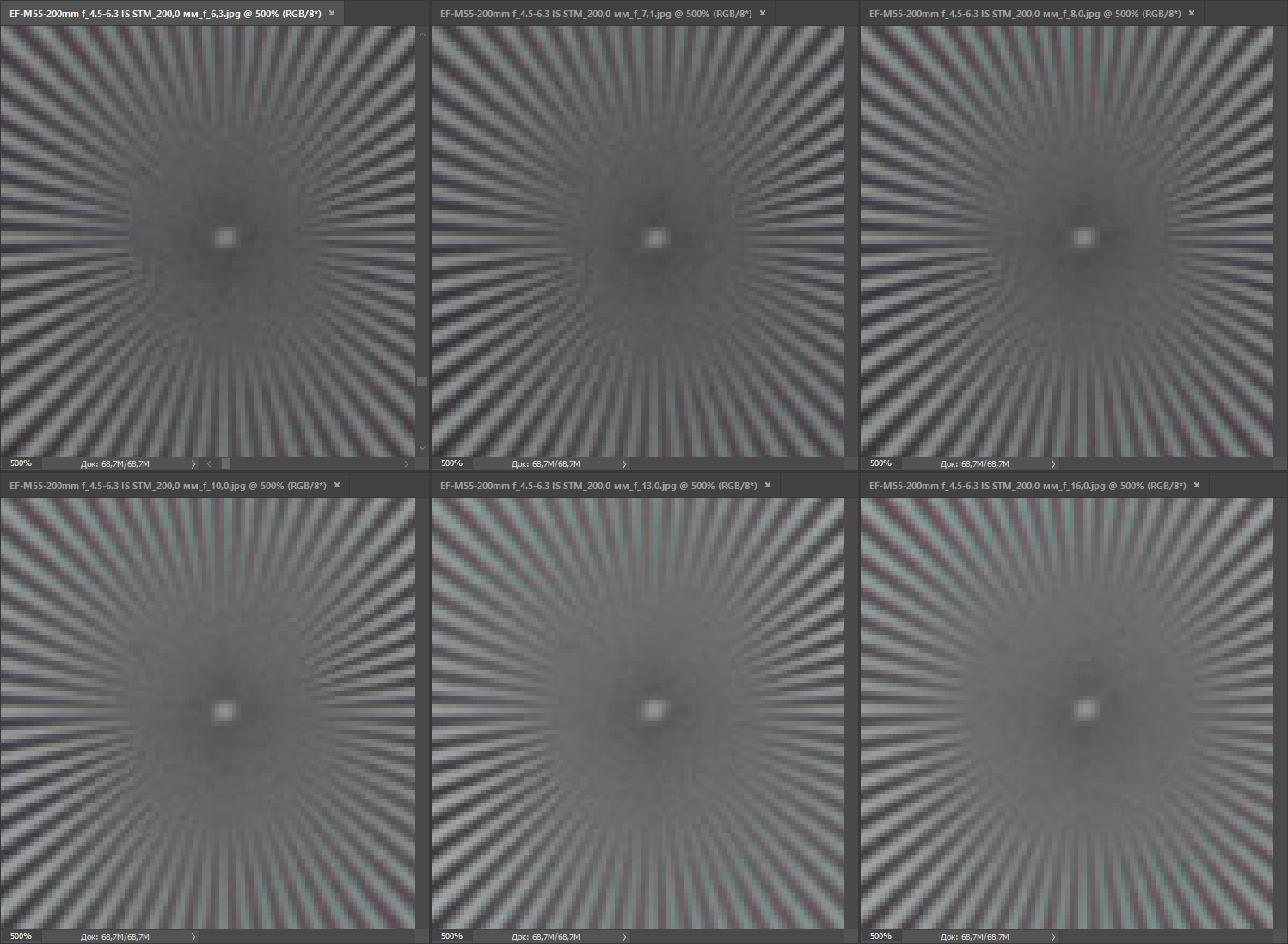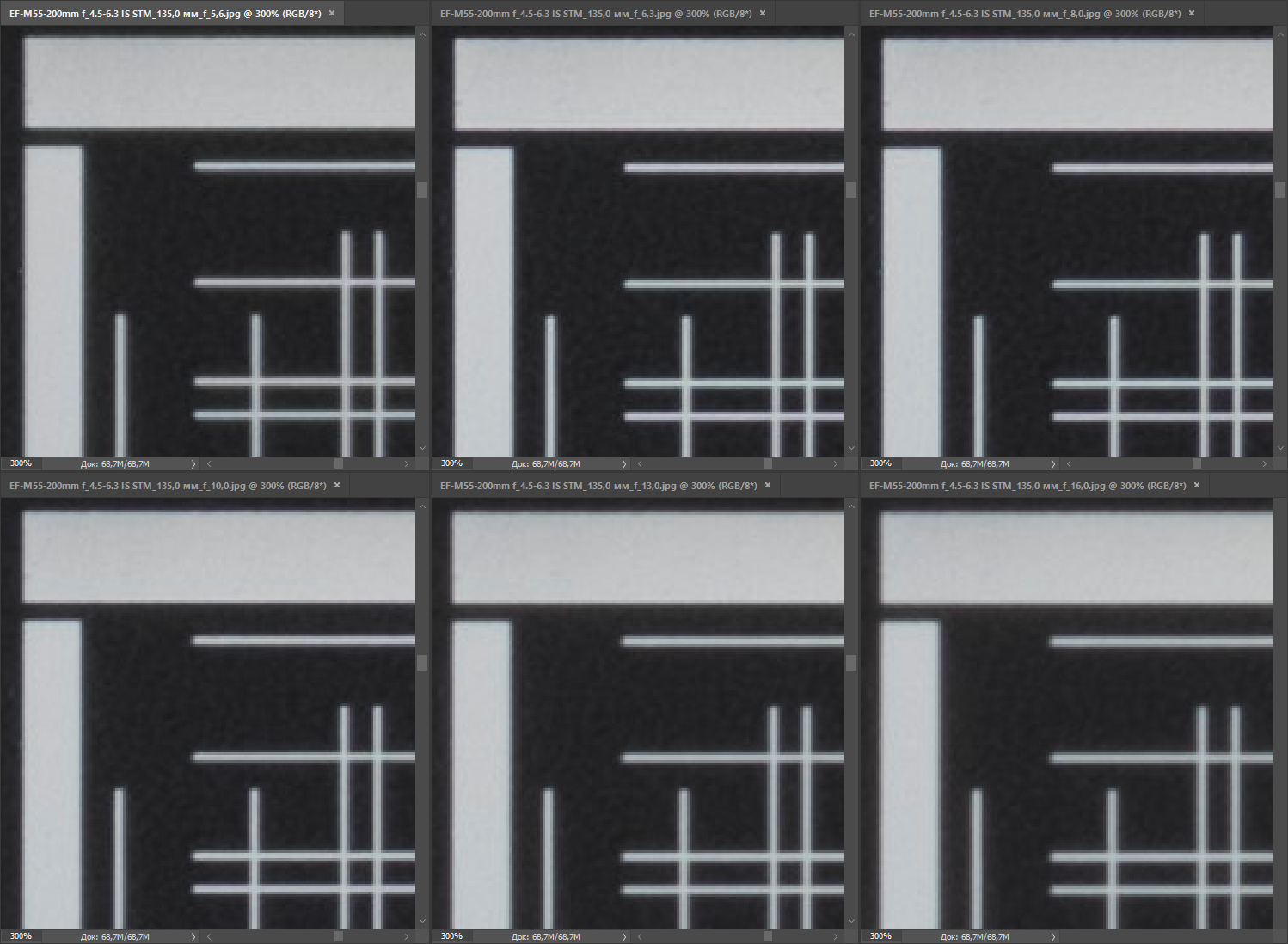 | на всех скриншотах верхний ряд: f/6,3 — f/7,1 — f/8, нижний ряд: f/10 — f/13 — f/16 | |