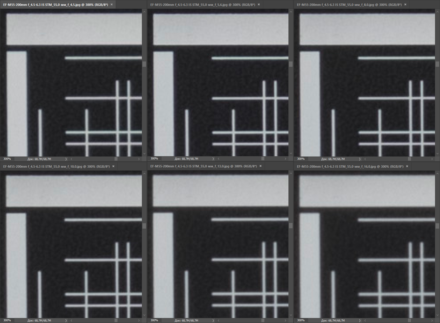 | на всех скриншотах верхний ряд: f/4,5 — f/5,6 — f/8, нижний ряд: f/10 — f/13 — f/16 | |