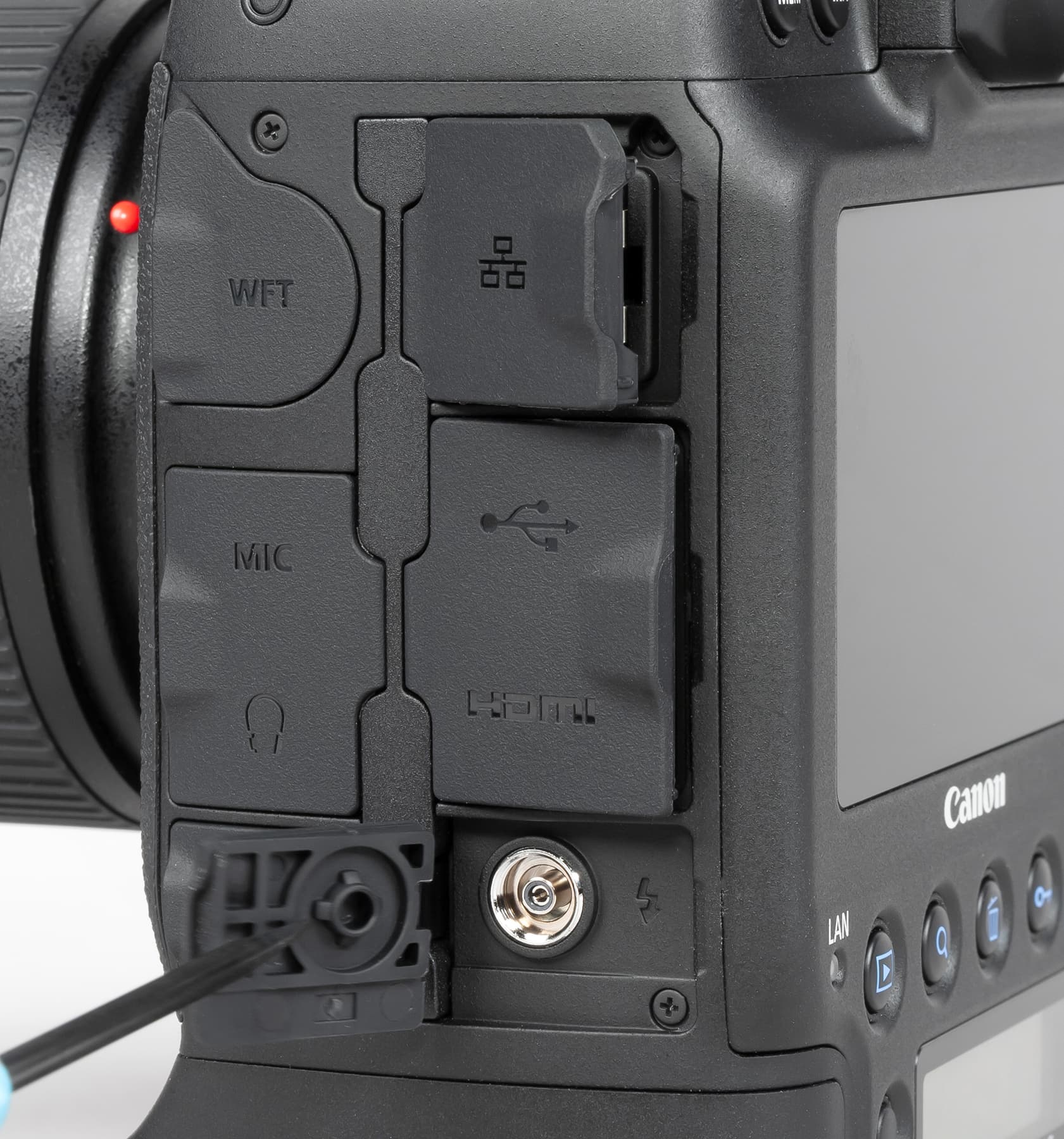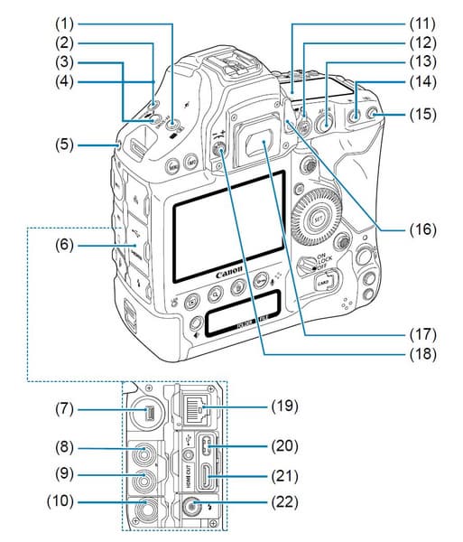 1 — кнопка экспокомпенсации вспышки / выбор режима экспозиционного замера; 2 — кнопка выбора режима съемки; 3 — режим «протяжки» / режим AF; 4 — установка режима баланса белого; 5 — крепление для дополнительного оборудования; 6 — заглушки разъемов; 7 — разъем устройств расширения; 8 — гнездо для подключения внешнего микрофона; 9 — гнездо для подключения наушников; 10 — разъем для подключения проводного пульта дистанционного управления; 11 — верхний ЖК-экранчик; 12 — выключатель Live View и видеосъемки, кнопка включения видеозаписи; 13 — кнопка принудительной автофокусировки; 14 — кнопка экспопамяти; 15 — кнопка выбора зоны АФ; 16 — кнопка шторки видоискателя; 17 — наглазник; 18 — колесико диоптрийной коррекции видоискателя; 19 — разъем RJ-45 Gigabit Ethernet; 20 — разъем USB 3.2 Gen 2 Type C; 21 — разъем Mini-HDMI; 22 — разъем синхронизации со вспышками.