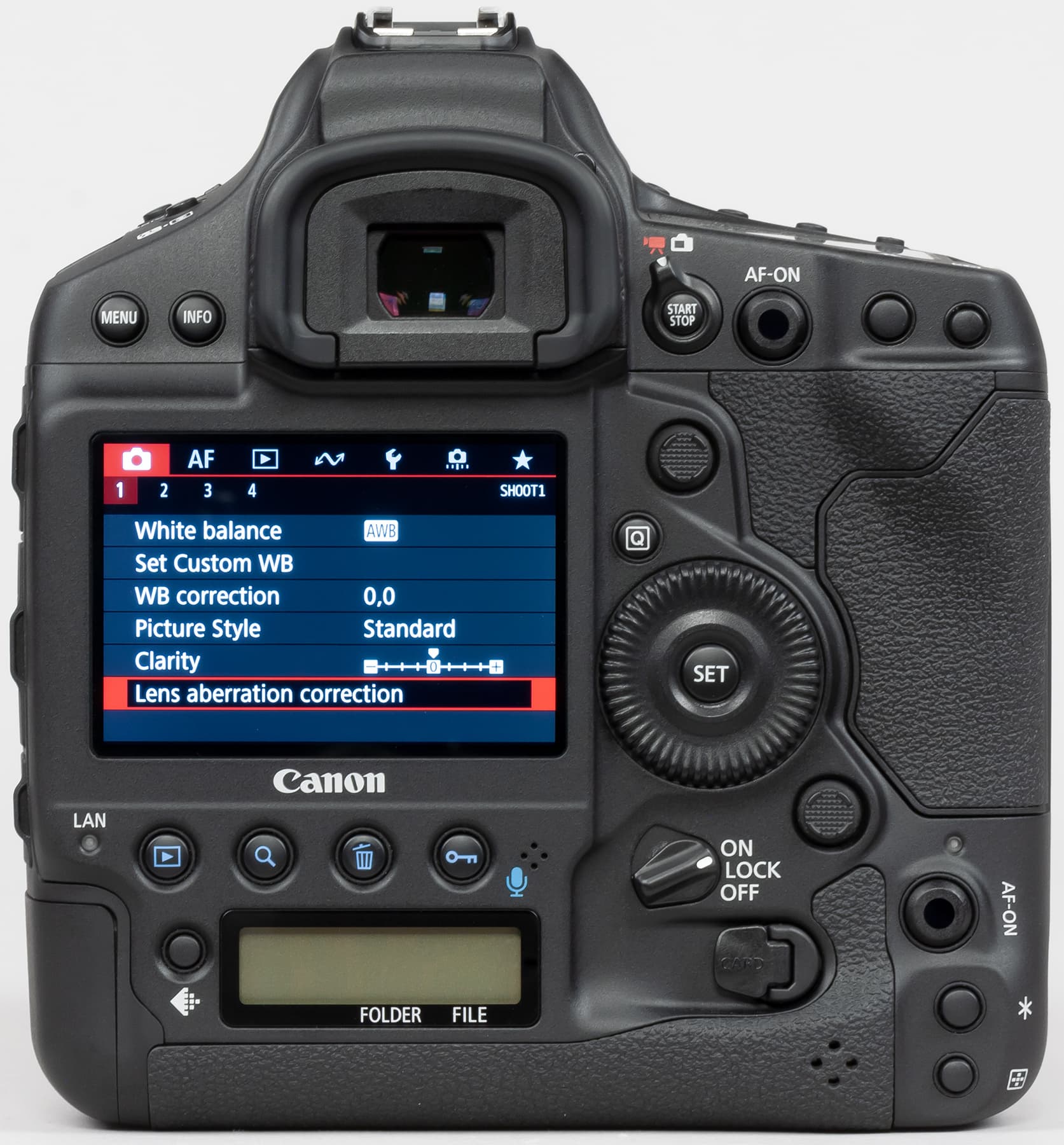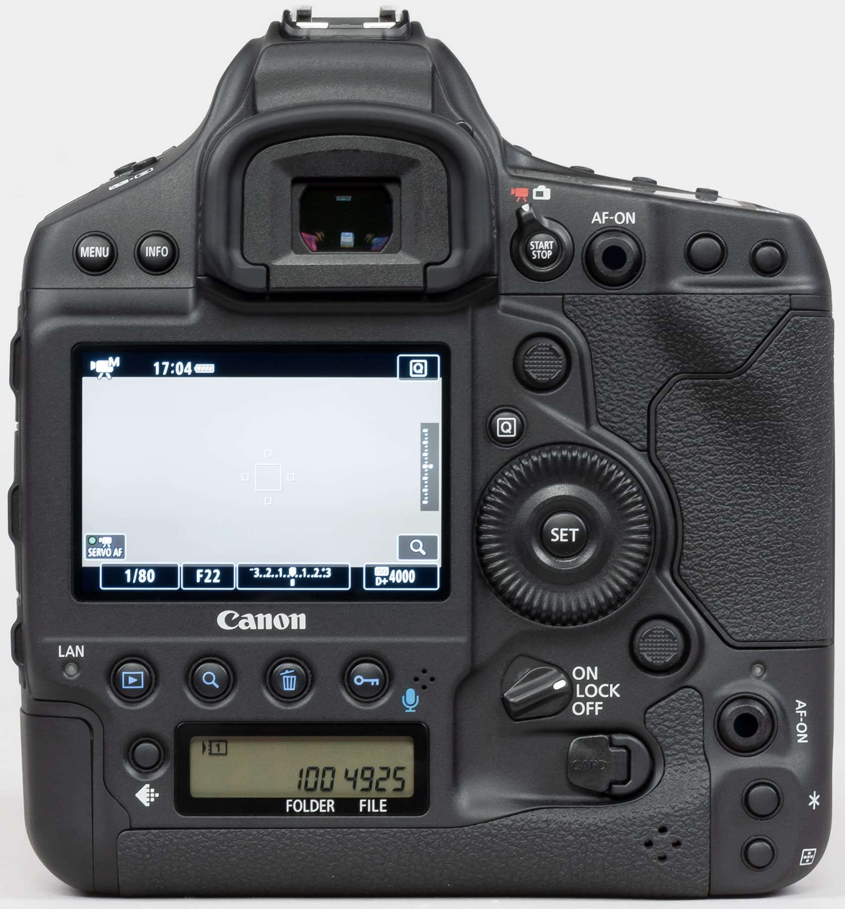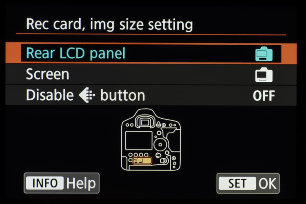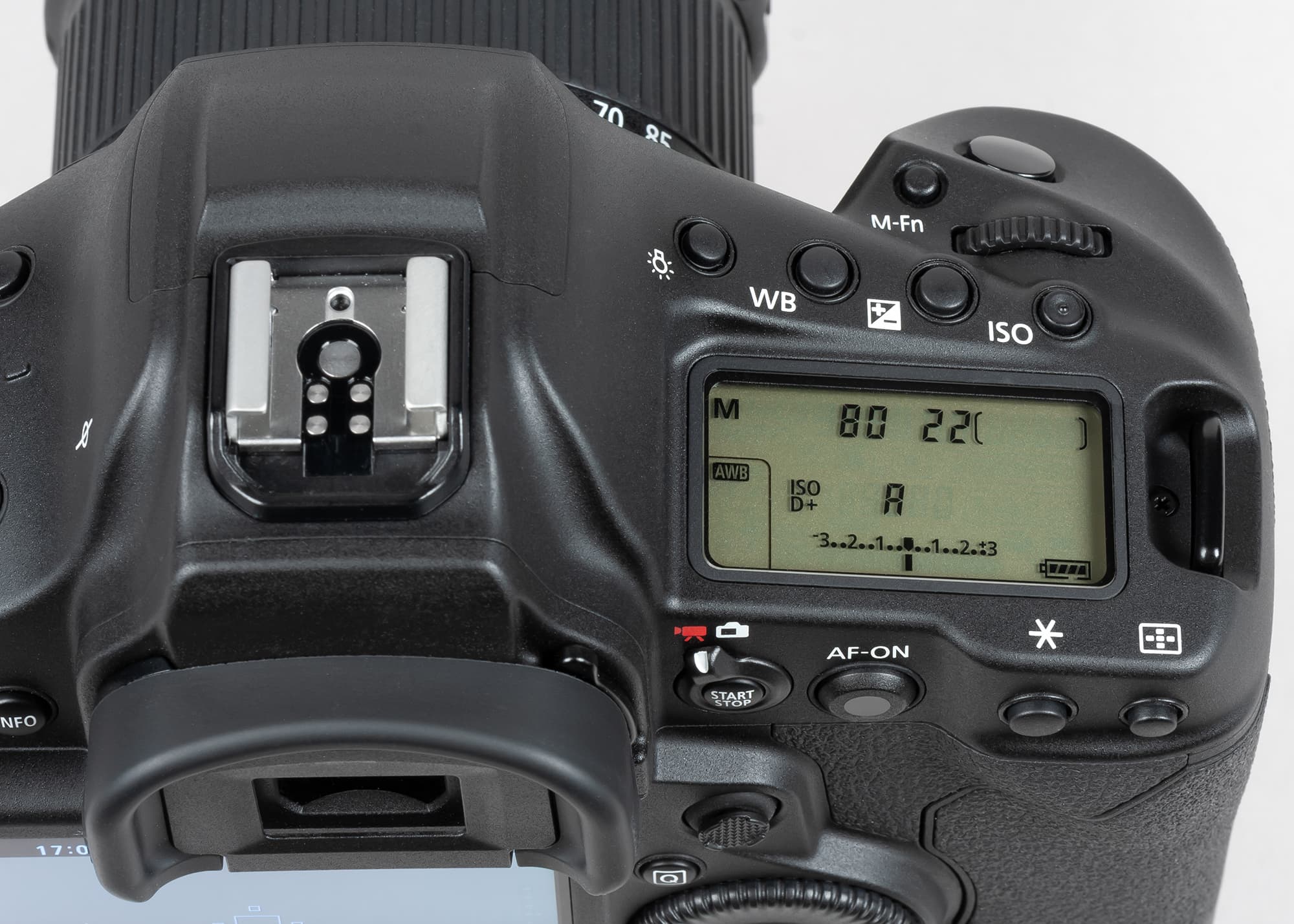Другим признаком принадлежности Canon EOS-1D X Mark III к топовым профессиональным камерам следует считать наличие сразу двух ЖК-экранчиков на корпусе: один из них располагается на верхней поверхности корпуса, а другой — на задней.