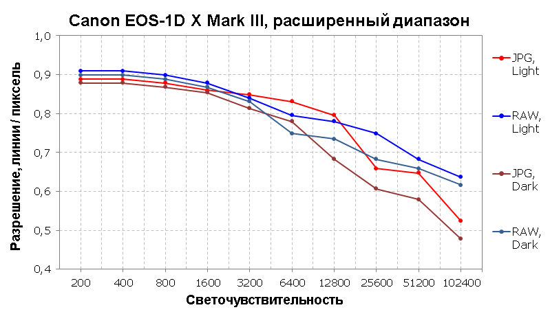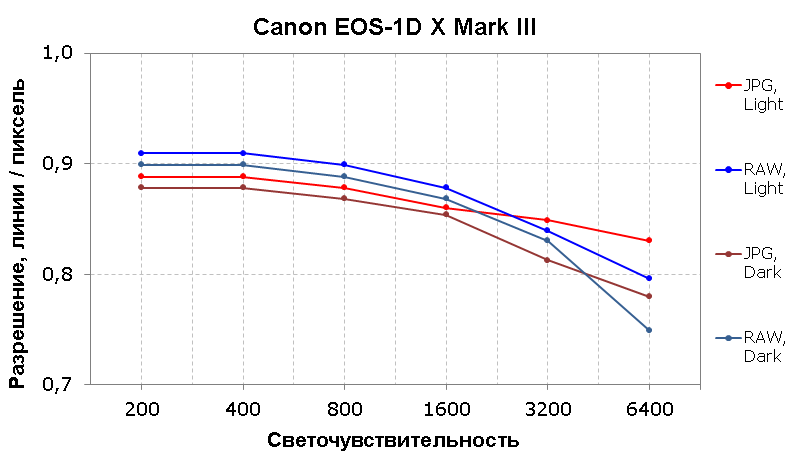 Получается, что по переносимости высоких ISO Canon EOS-1D X Mark III легко обходит практически все камеры, которые мы исследовали в последнее время. Ни у одной из них мы не могли получить столь высокого качества картинки даже при ISO 3200, а в случае с нашей героиней планка переносимости поднялась до ISO 12800.