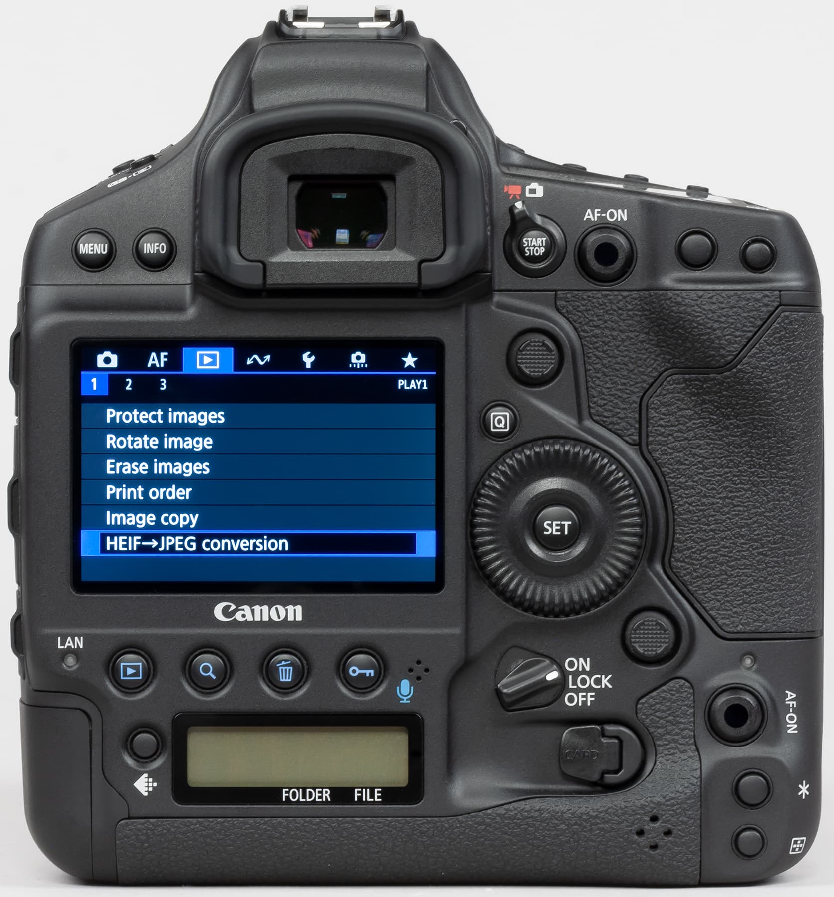 | Формат записи фотоснимков | JPEG: 10 видов сжатия; HEIF: 10 видов сжатия (10 бит, 4:2:2, BT2100); RAW: без сжатия ((14-битный Canon RAW версии 2)и со сжатием (C-RAW); совместимость с Exif 2.31 и Design rule for Camera File system 2.0; совместимость с цифровым форматом управления печатью [DPOF] версии 1.1 |