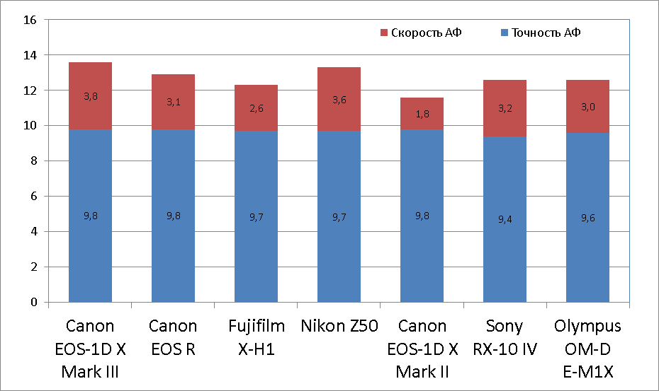 По общему зачету автофокус камеры на данный момент является лучшим из всех протестированных. По точности новая камера осталась на уровне предыдущей модели, а также системы EOS R, но по скорости ей нет равных среди протестированных нами аппаратов.