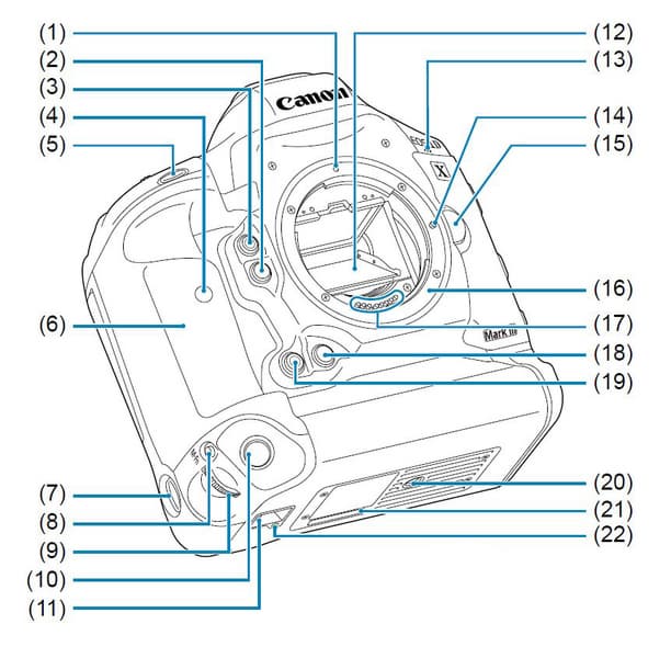 1 — маркер для установки объектива; 2 — кнопка контроля глубины резкости; 3 — многофункциональная кнопка 2; 4 — индикатор автоспуска; 5 — кнопка спуска затвора; 6 — ручка для удержании камеры в горизонтальном положении; 7 — выключатель органов управления на вертикальной ручке; 8 — многофункциональная кнопка вертикальной ручки (область АФ / режим АФ / экспопамять / многосегментный экспозамер); 9 — главное колесо установки параметров вертикальной ручки; 10 — кнопка спуска затвора на вертикальной ручке; 11 — крепление для шейного ремня; 12 — зеркало; 13 — микрофон для видеозаписи; 14 — замок для объектива; 15 — кнопка разблокировки объектива; 16 — байонетное крепление объектива; 17 — контактная группа; 18 — кнопка контроля глубины резкости при съемке в вертикальном положении; 19 — многофункциональная кнопка 2 при съемке в вертикальном положении; 20 — резьба для установки на штатив; 21 — серийный номер камеры; 22 — отверстие для установки дополнительного оборудования.