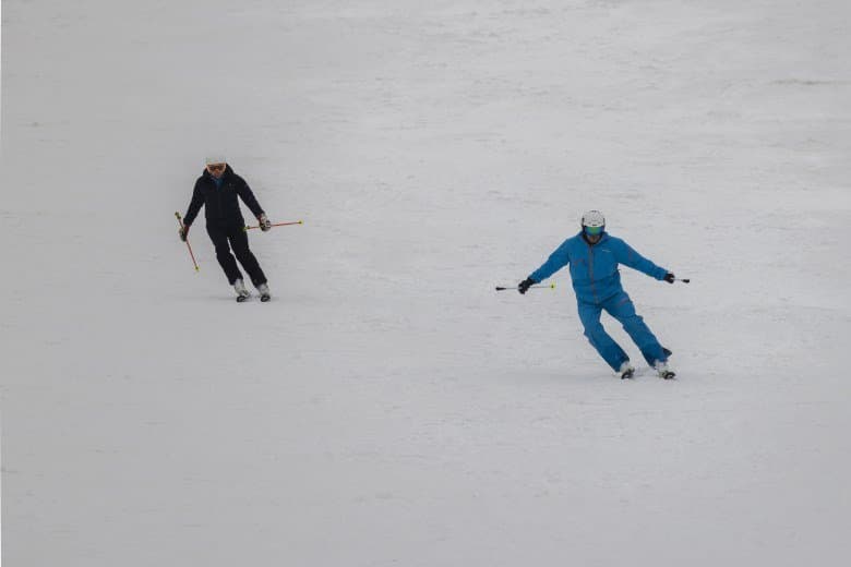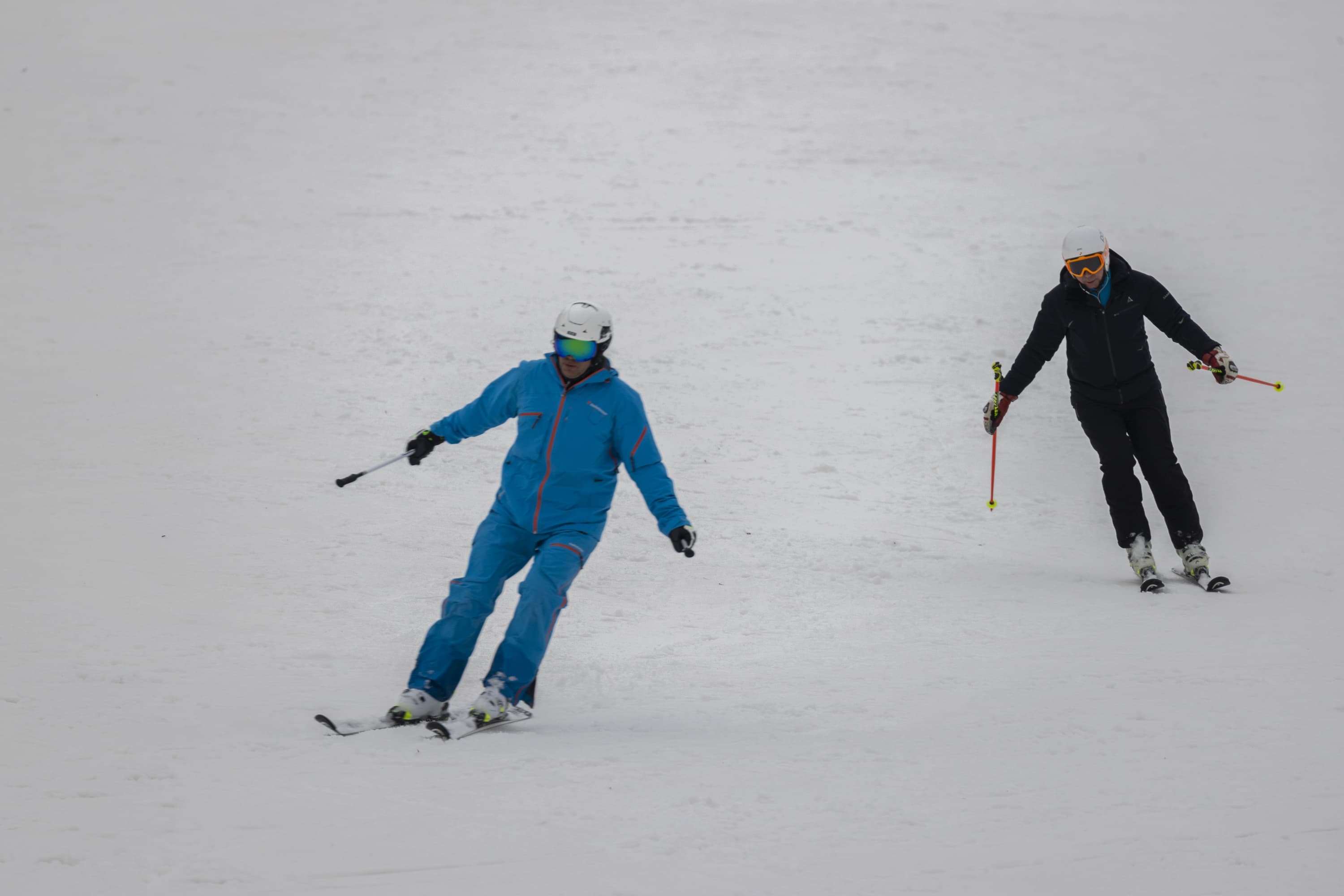 И последнее испытание. Снимаем парный горнолыжный спуск, при котором лыжники перемещаются, периодически перекрывая друг друга. Съемка события как единого процесса, тремя микросериями: 3 + 4 + 2 кадра при неизменном фокусном расстоянии. Интервал между ними — около 1 секунды. Фокусное расстояние 400 мм; F7,1; 1/500 c; ISO 100. Фокусировка по синему лыжнику.