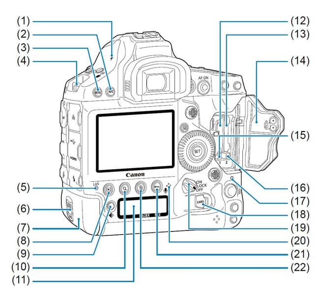 1 — маркировка фокальной плоскости; 2 — кнопка просмотра параметров; 3 — кнопка вызова меню; 4 — крепление для ремня; 5 — индикатор активности сетевого подключения; 6 — замок батарейного отсека; 7 — аккумуляторная батарея; 8 — кнопка просмотра отснятого материала; 9 — кнопка выбора карты памяти / размер изображения; 10 — список отснятых кадров / увеличение и уменьшение изображения на дисплее; 11 — задний ЖК-экранчик; 12 — первый слот для карт памяти; 13 — второй слот для карт памяти; 14 — крышка отсека со слотами для карт памяти; 15 — кнопка выброса первой карты; 16 — кнопка выброса второй карты; 17 — индикатор активности записи на карты памяти; 18 — замок крышки отсека для карт памяти; 19 — выключатель питания и блокировки органов управления; 20 — микрофон для голосовых комментариев; 21 — кнопка защиты от стирания и ввода голосовых комментариев; 22 — кнопка стирания отснятого материала.