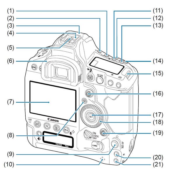 1 — кнопка выбора способа установки баланса белого; 2 — кнопка включения подсветки ЖК-экранчиков; 3 — антенна GPS-приемника; 4 — полнофункциональный «горячий башмак»; 5 — контакты для синхронизации со вспышкой; 6 — наглазник; 7 — дисплей; 8 — кнопка быстрой установки параметров; 9 — кнопка включения принудительной автофокусировки на вертикальной ручке; 10 — динамик; 11 — кнопка экспокомпенсации или установки значения диафрагмы; 12 — выбор зоны АФ / режим АФ / многофункциональная кнопка / экспопамять / многосегментный экспозамер; 13 — кнопка установки ISO / просмотр текущего времени; 14 — главное колесо установки параметров; 15 — крепление для шейного ремня; 16 — джойстик; 17 — кнопка «установить»; 18 — заднее колесо установки параметров; 19 — джойстик вертикальной ручки; 20 — кнопка экспопамяти вертикальной ручки; 21 — кнопка выбора точки АФ вертикальной ручки.