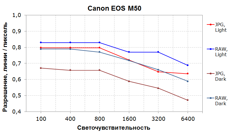 В светлой сцене разрешение RAW-файла высокое, отрабатывается почти 85% сенсора вплоть до ISO 800 и чуть больше 75% на ISO 6400. JPEG здесь практически не отстает. В темной сцене RAW показывает чуть худшее разрешение, а вот JPEG сильно проваливается: видимо, внутренняя программная обработка камеры не справляется с таким уровнем шумов и слишком грубо все размазывает.