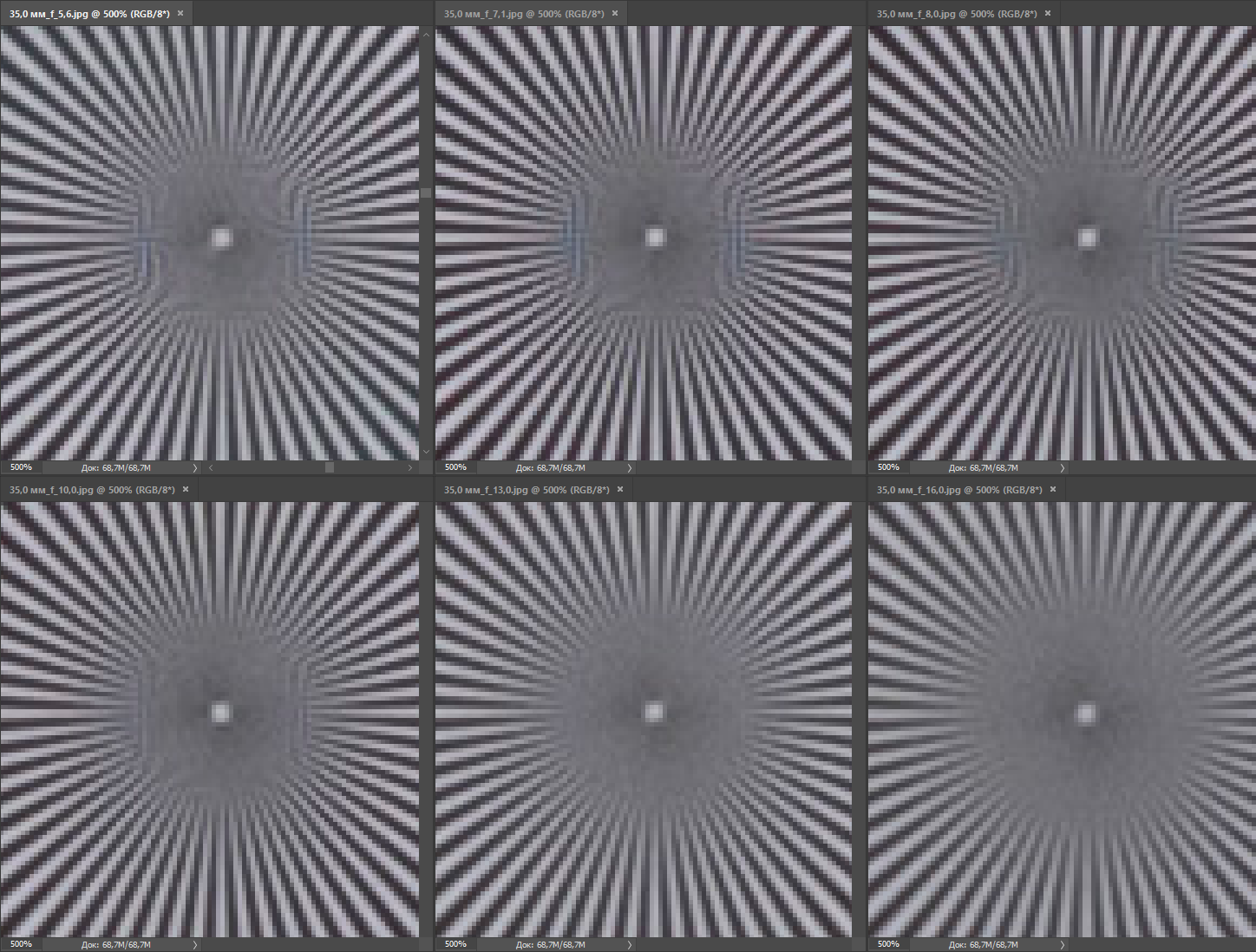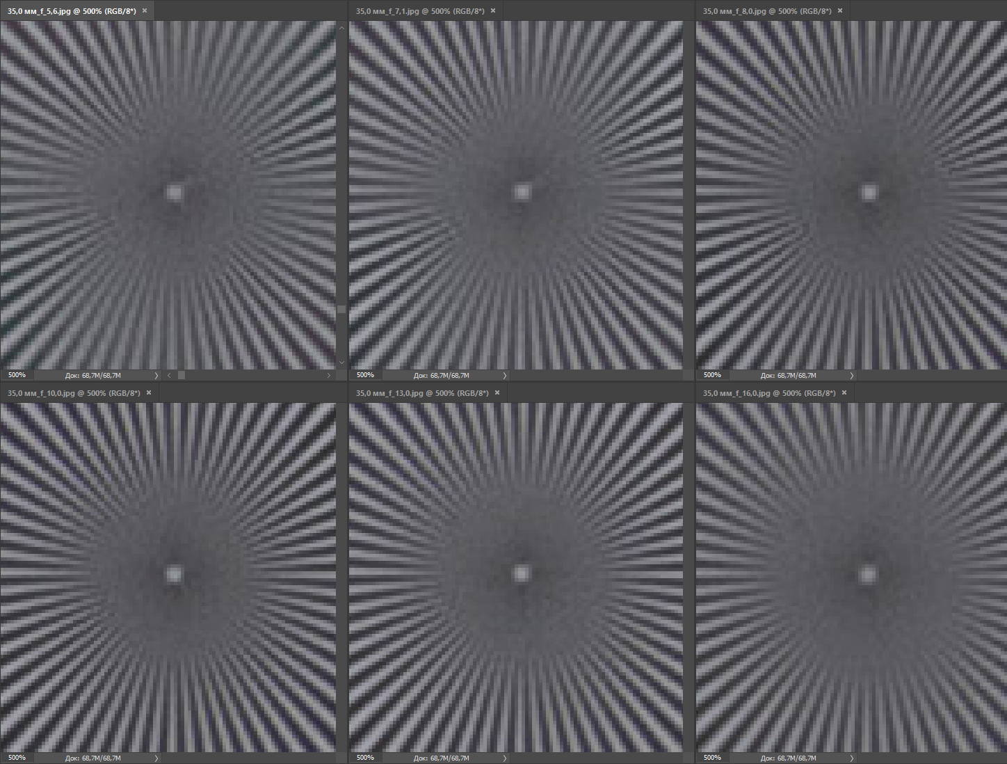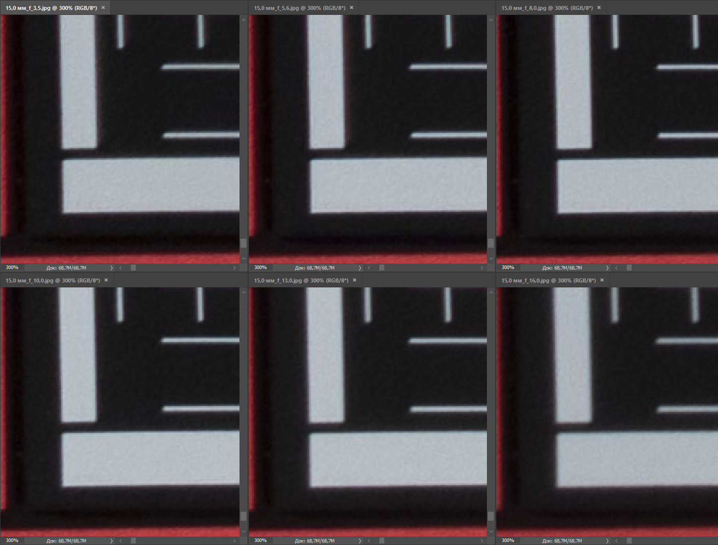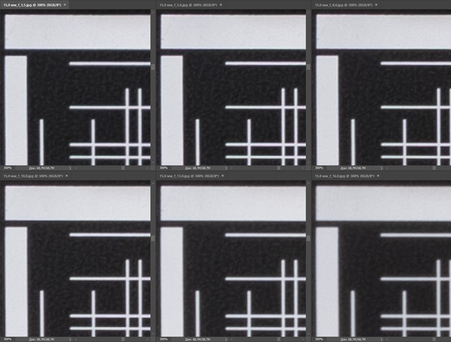 Среднее положение объектива демонстрирует более высокий результат: здесь оптика отрабатывает уже 80% сенсора, а на F8 — еще больше. Разрешение на краю кадра также стало выше, разрыв с центром уменьшился. Хроматические аберрации по-прежнему едва заметны, а вот в углах кадра можно обнаружить легкую бочкообразную дисторсию.