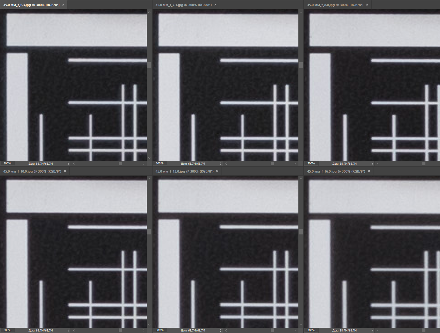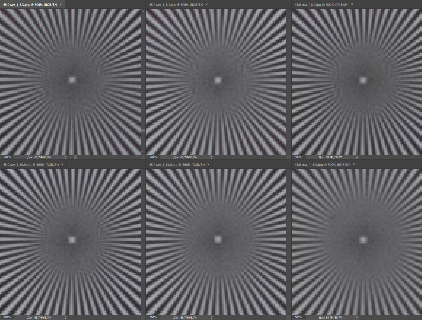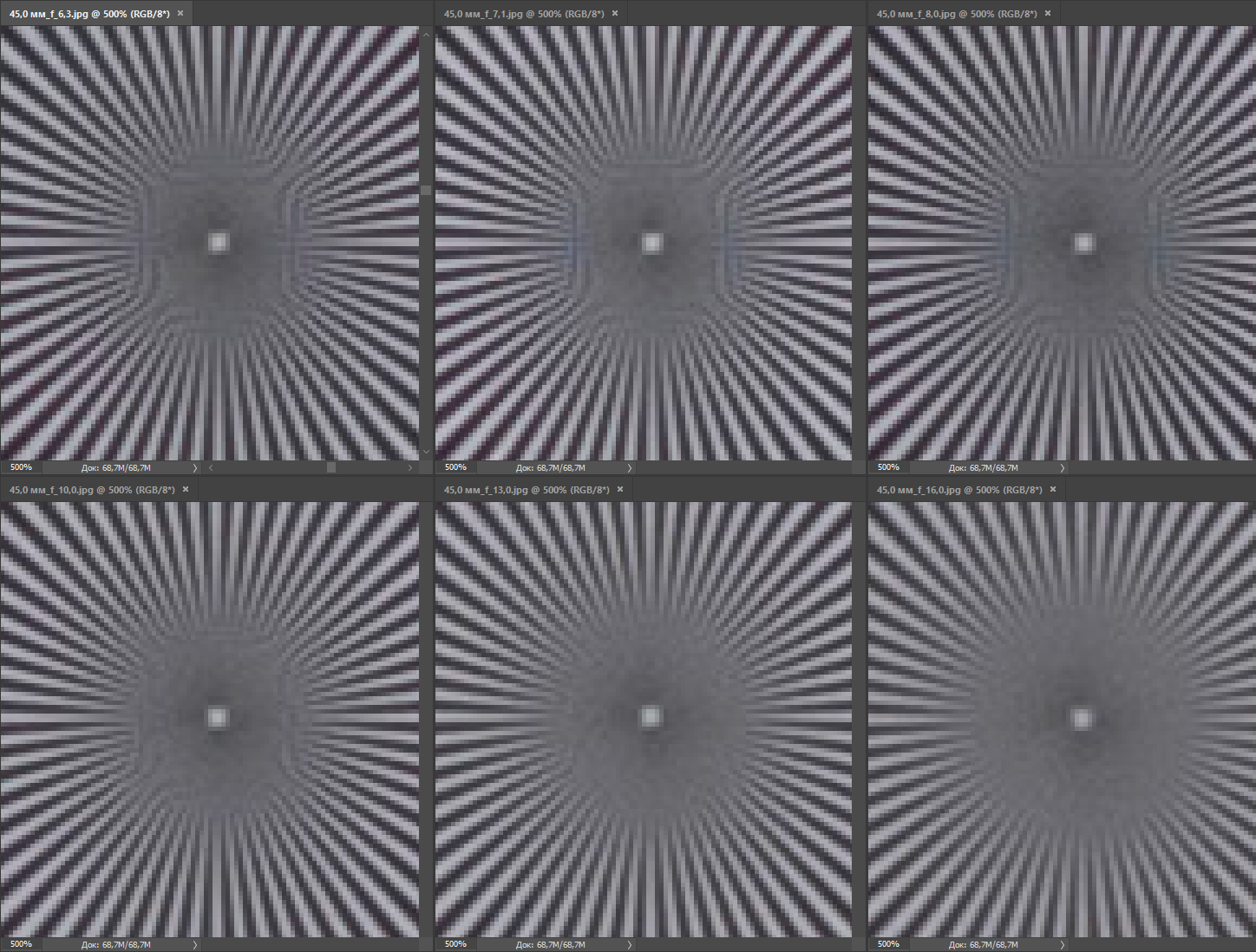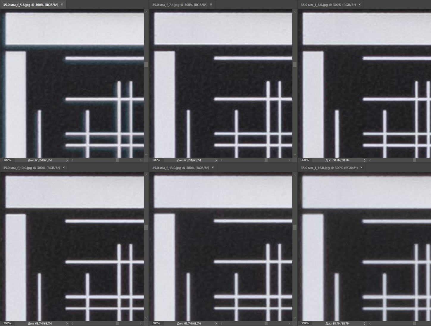 Среднее положение объектива демонстрирует более высокий результат: здесь оптика отрабатывает уже 80% сенсора, а на F8 — еще больше. Разрешение на краю кадра также стало выше, разрыв с центром уменьшился. Хроматические аберрации по-прежнему едва заметны, а вот в углах кадра можно обнаружить легкую бочкообразную дисторсию.